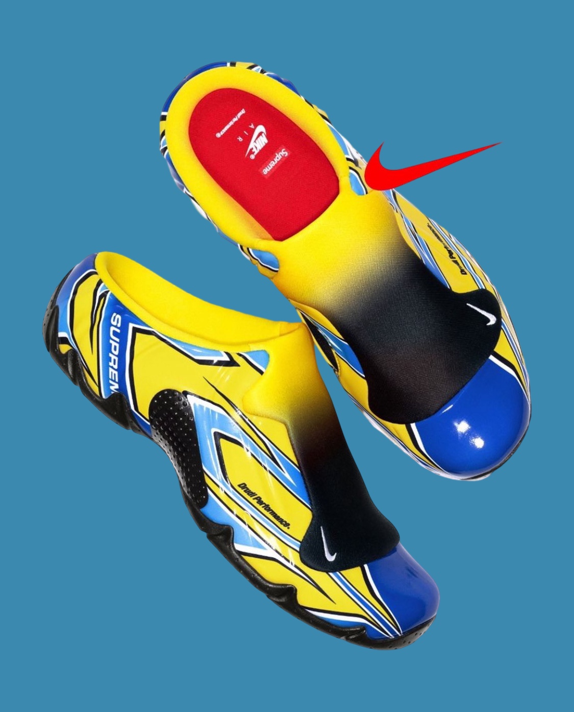 Supreme x Nike Clogposite 分别带来一款黑色和两款彩色的联名新品,在鞋身侧边和鞋垫上都有 Supreme 的字样。