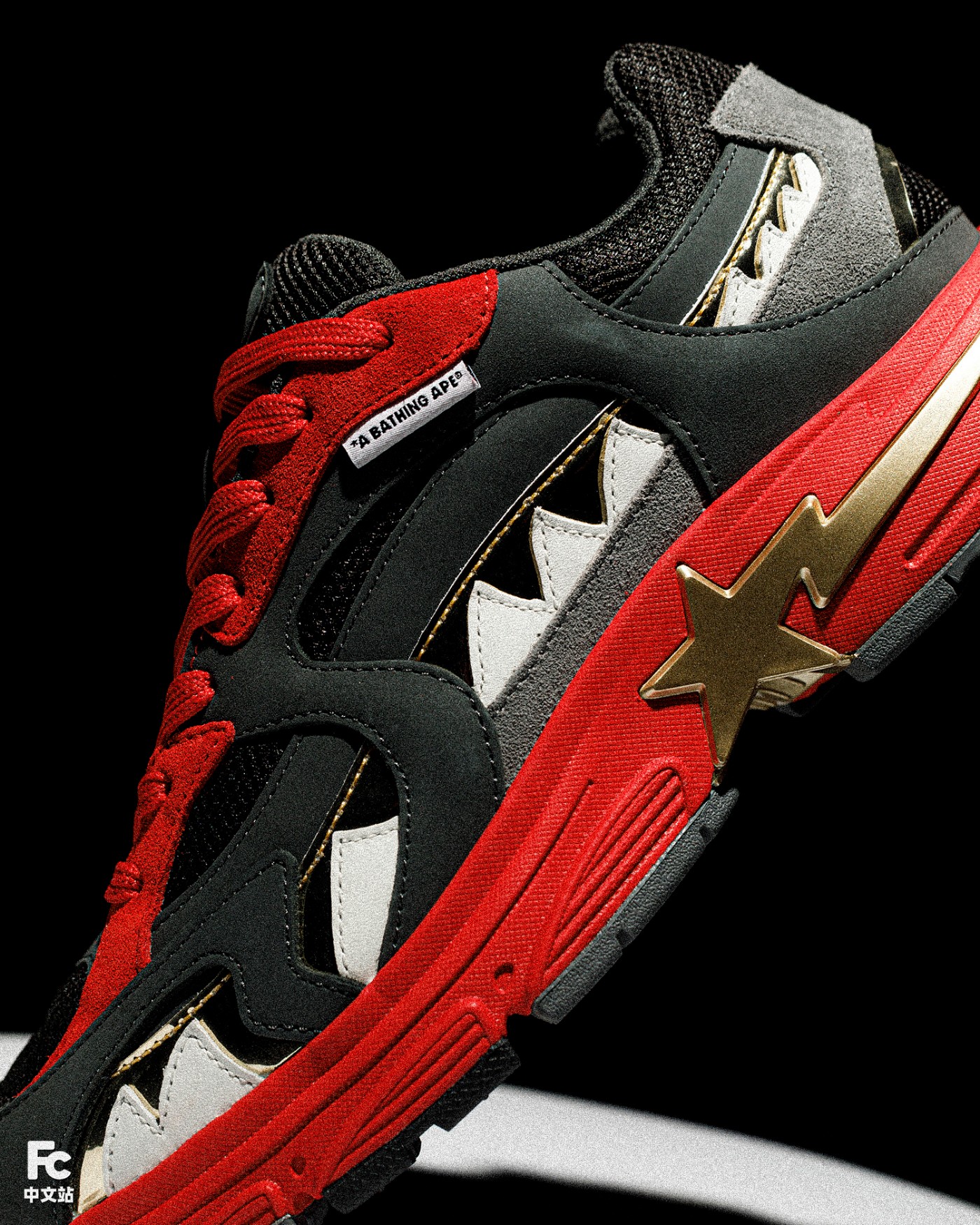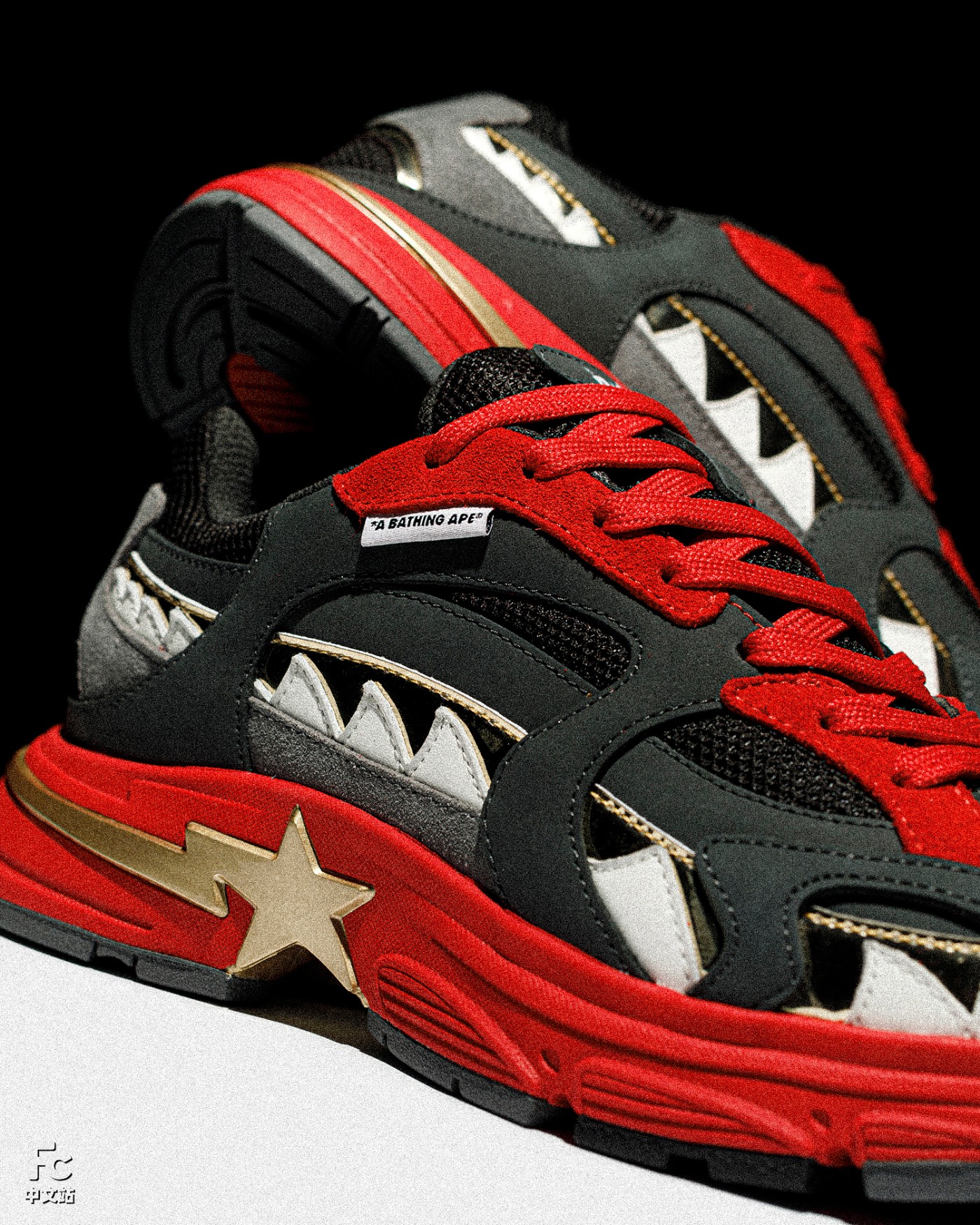 鞋身两侧包裹的鲨鱼齿一定是点睛之笔,TPU 外底点缀有经典 BAPE STA™ LOGO 徽标,进一步提升辨识度。
