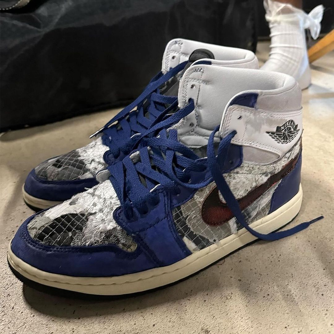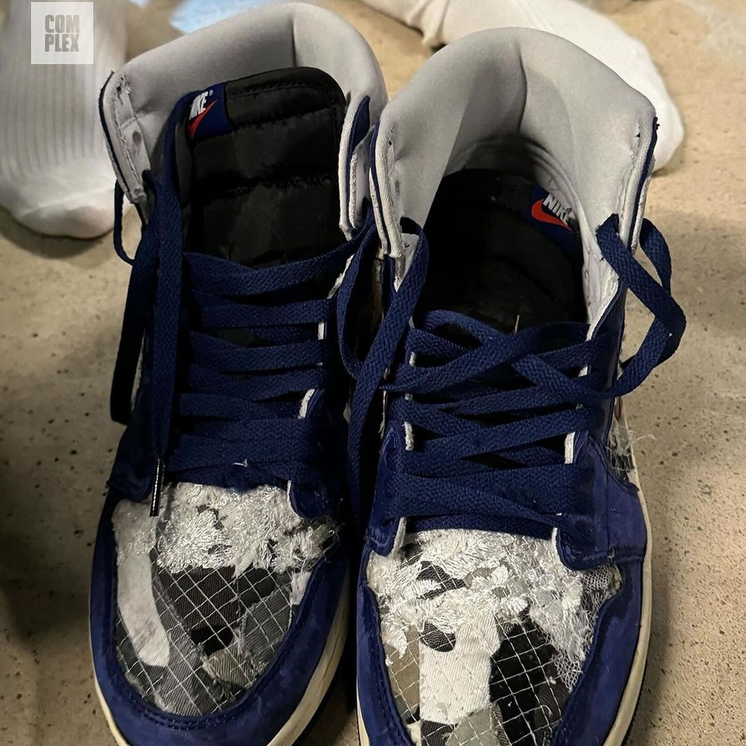 另一双是以 Air Jordan 1 为蓝本,鞋面类似牛仔裤的拼布设计,配合擦色处理,给人以强烈的手工质感。