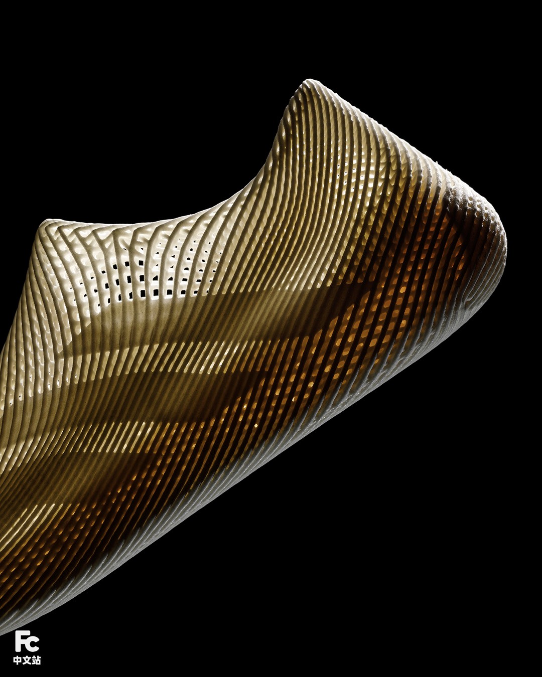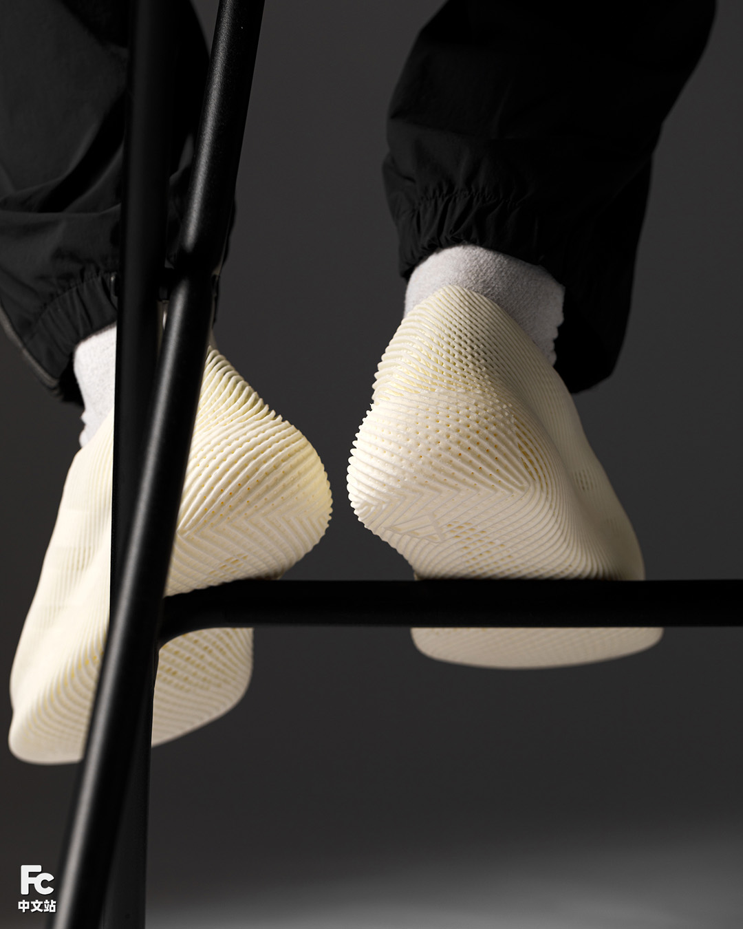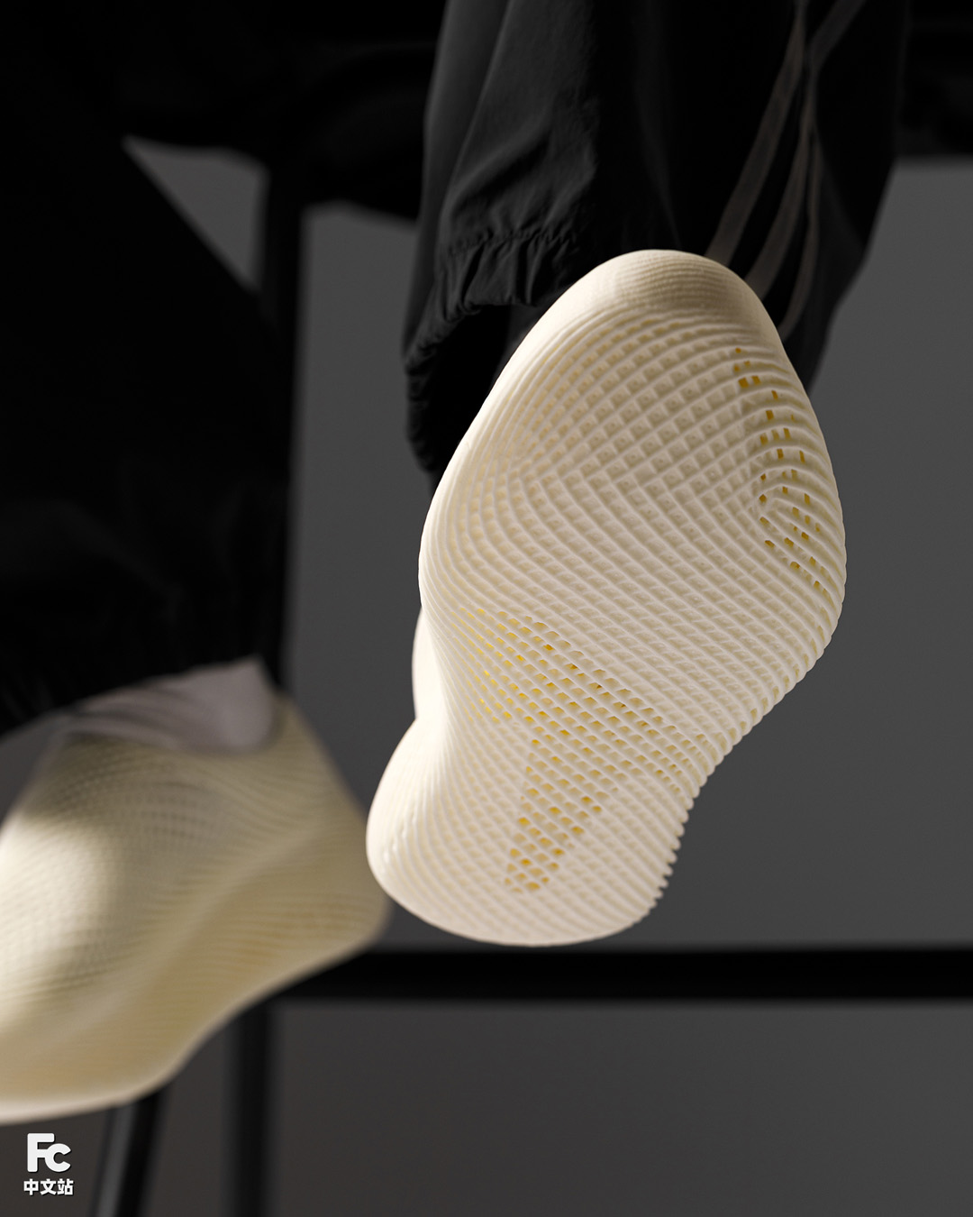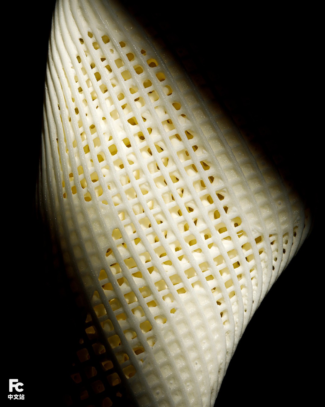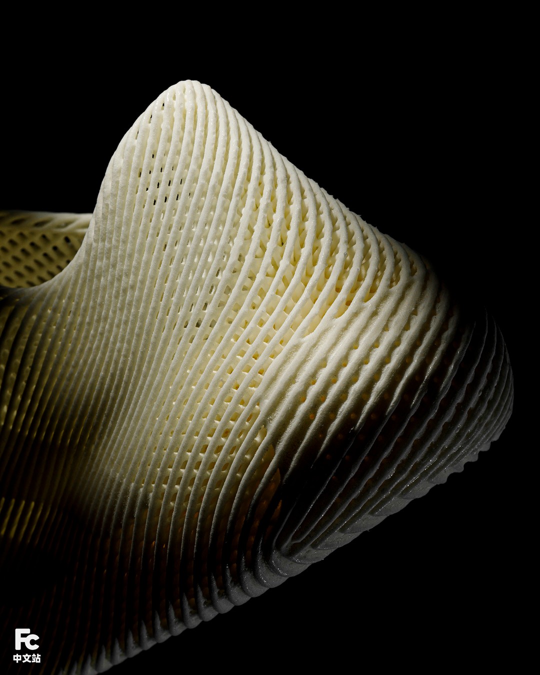 adidas 早期的打印材料偏向硬塑料,如果玩过模型,可以理解为差不多是板件流道的质感,而这次最新研发的材质,则更像是具备韧性的软橡胶。