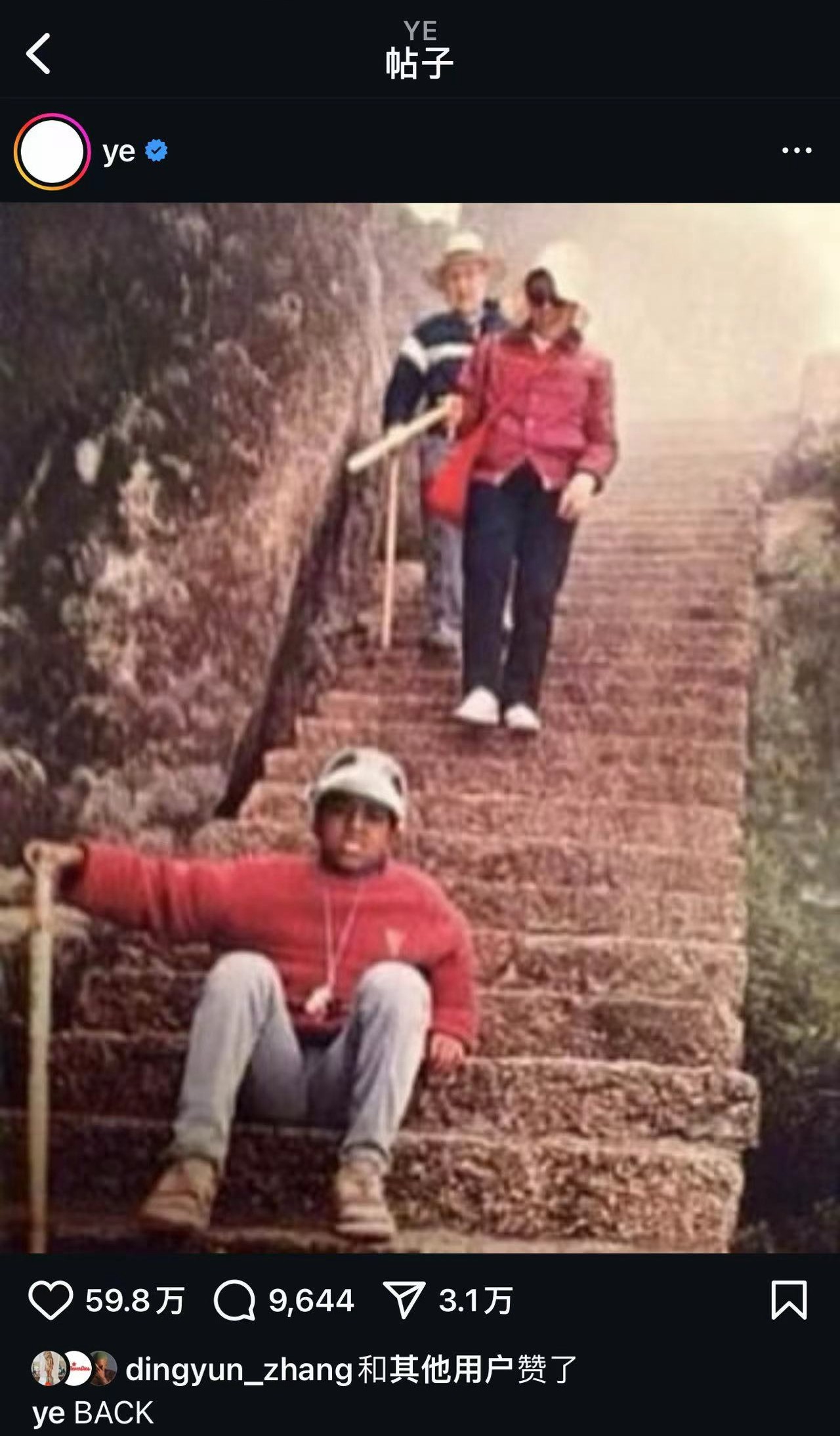 最新一条则是晒出了儿时在中国爬山的旧照,并配文 BACK。
