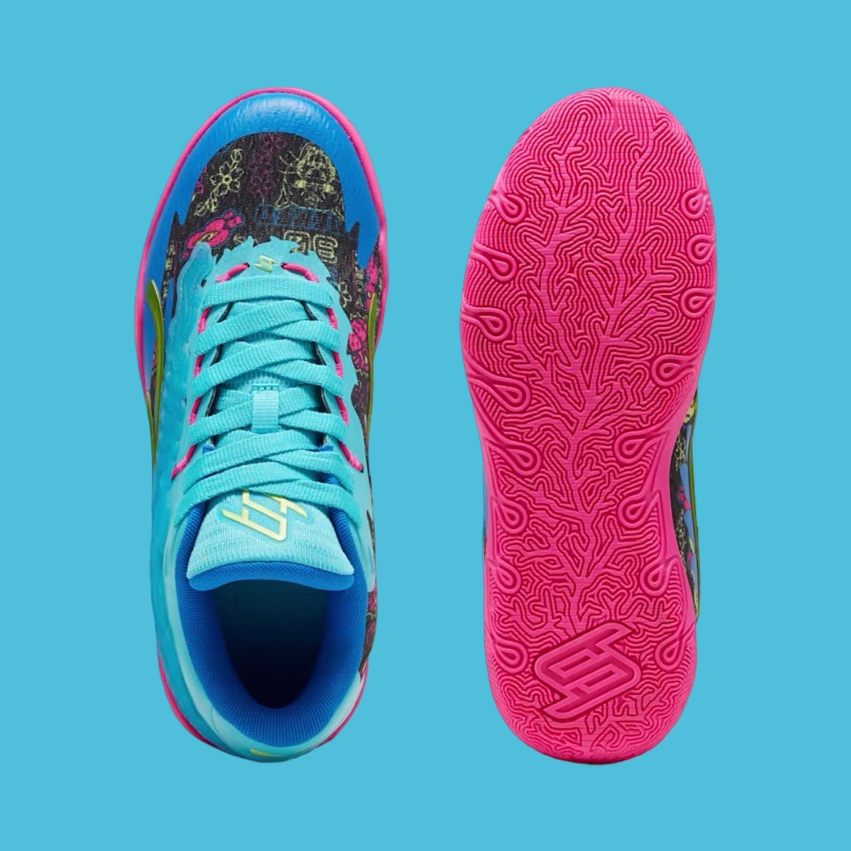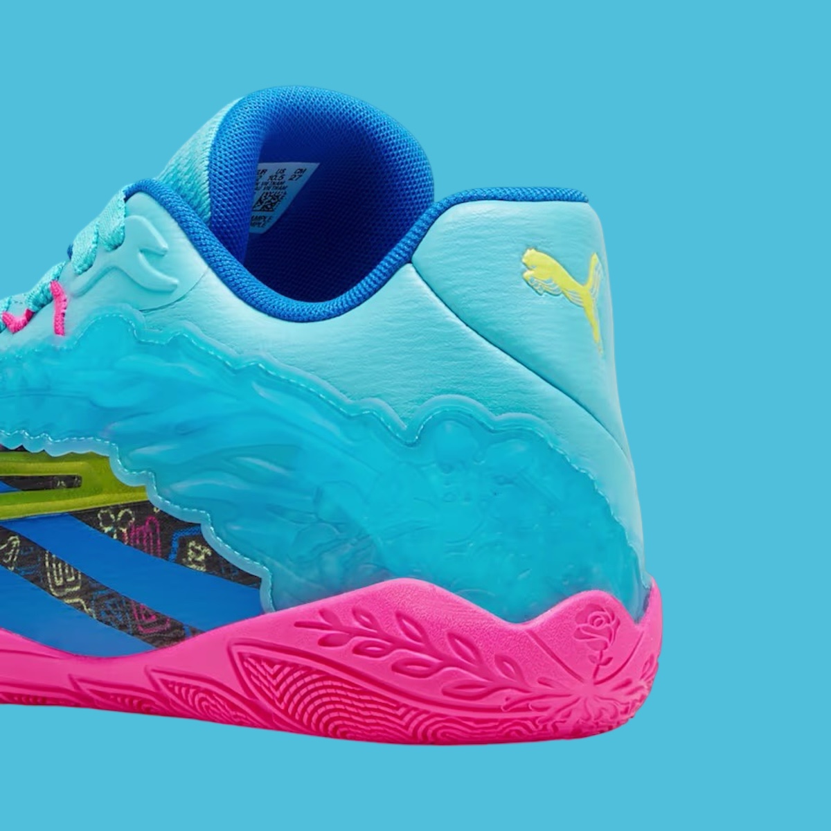 蓝粉撞色鞋身搭配鞋面多彩的霓虹字体勾勒,与赛博氛围的东京夜景无比契合。