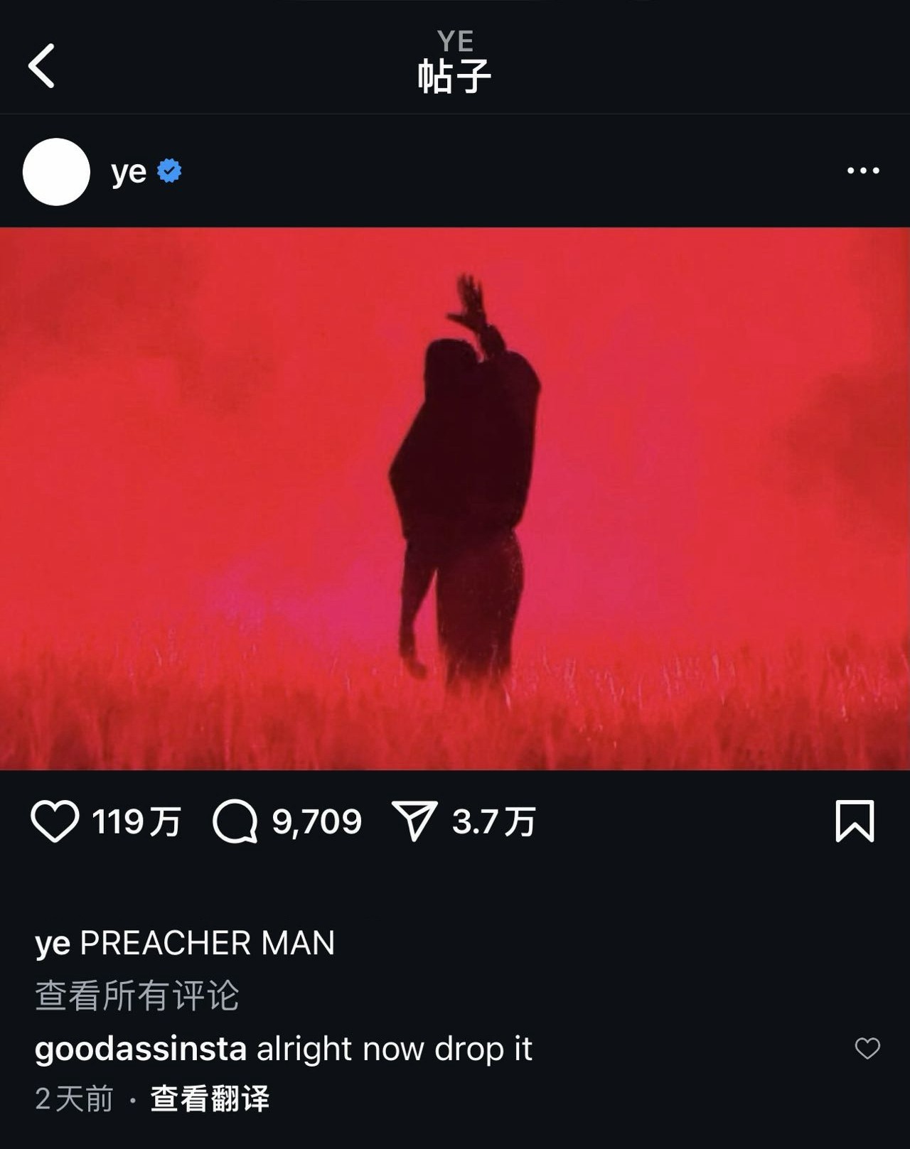 翻看侃爷的社交平台,目前共有三条帖子,最新一条分享的是演出照,并配文 PREACHER MAN(传教士)。