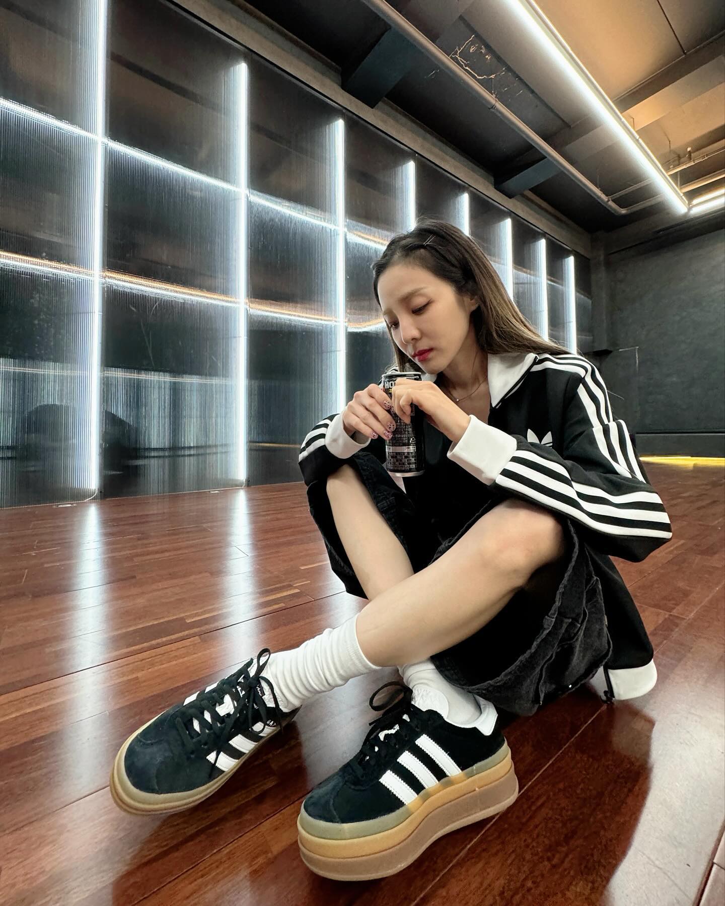 除了 Samba 以外,同样有不错人气的 Gazelle 也时常上脚搭配,朴山多拉潮流品味不用多说。