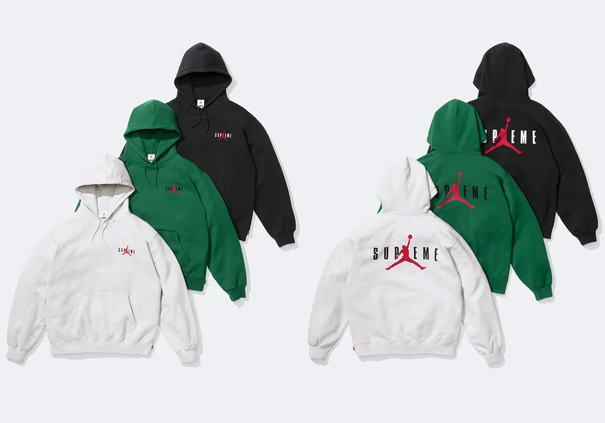 Supreme 字样结合飞人 Jumpman Logo 是辨识度最高的经典元素,3 款不同配色的帽衫则在前胸和后背呈现了该图案,有着极高的街头吸睛效果。
