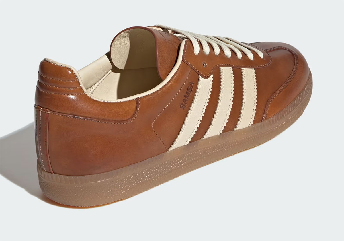 这双 adidas Samba Made In Italy 采用了手工抛光的小牛皮材质打造,以棕色色调呈现,配合米白色的三条杠和内衬。