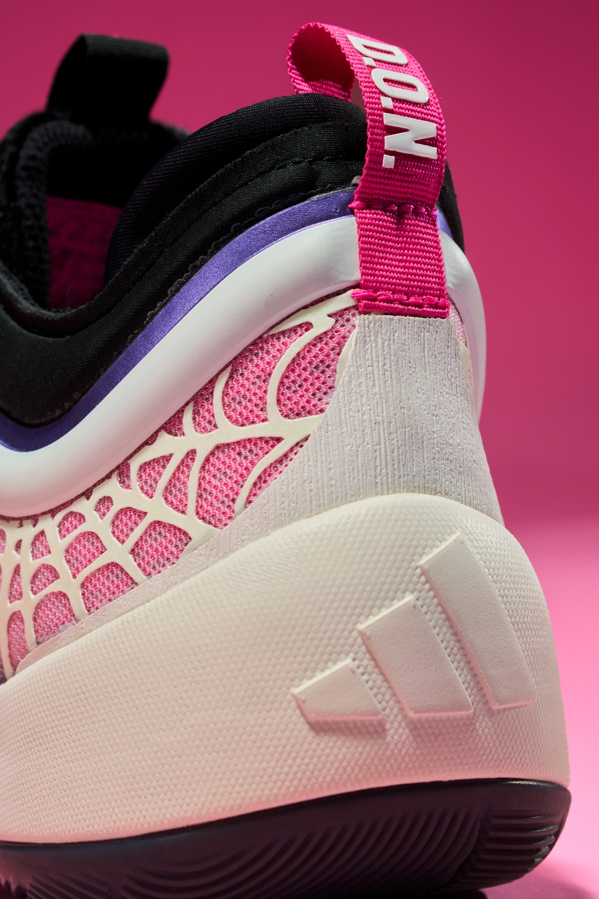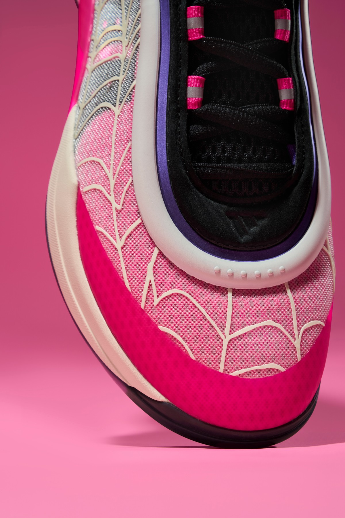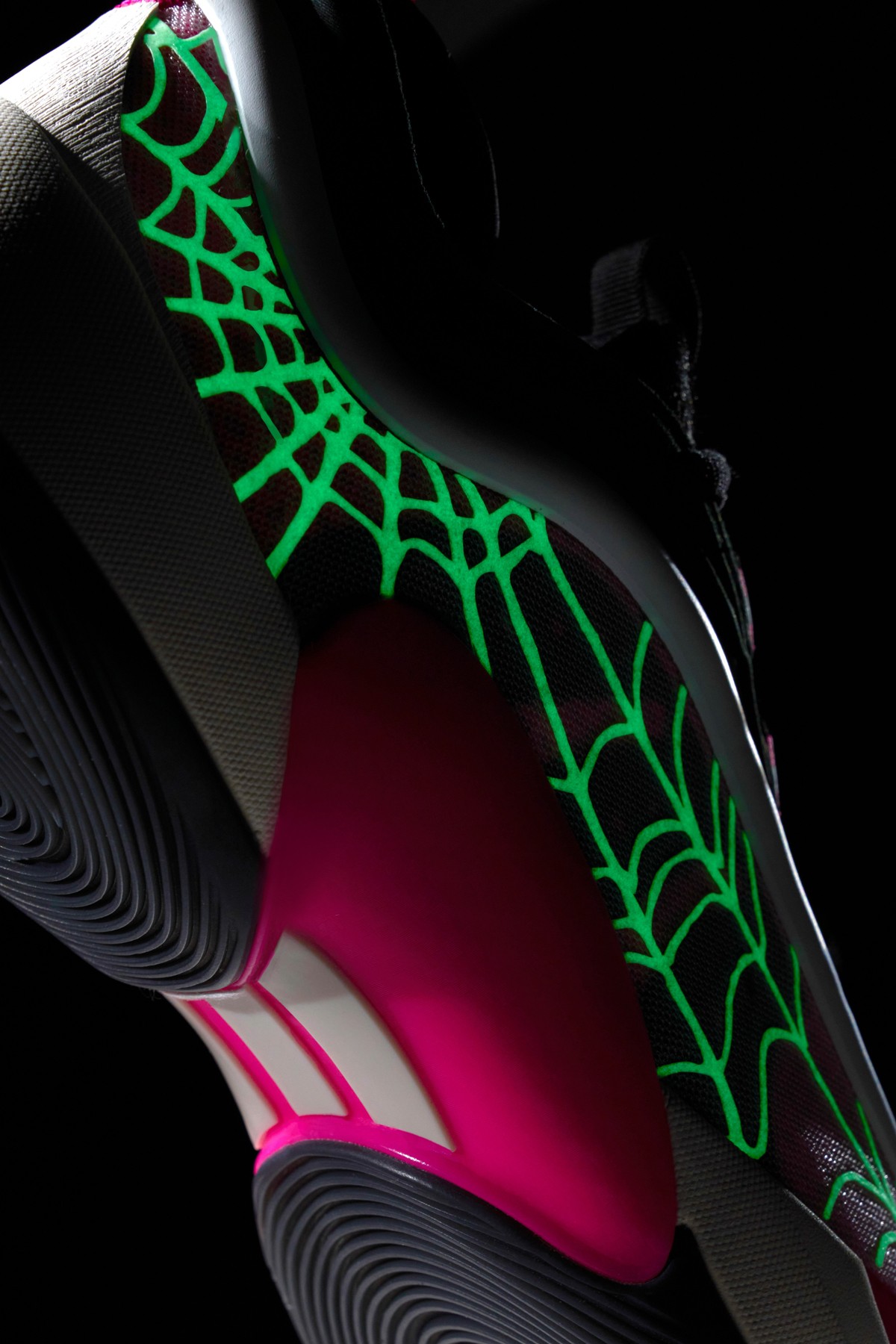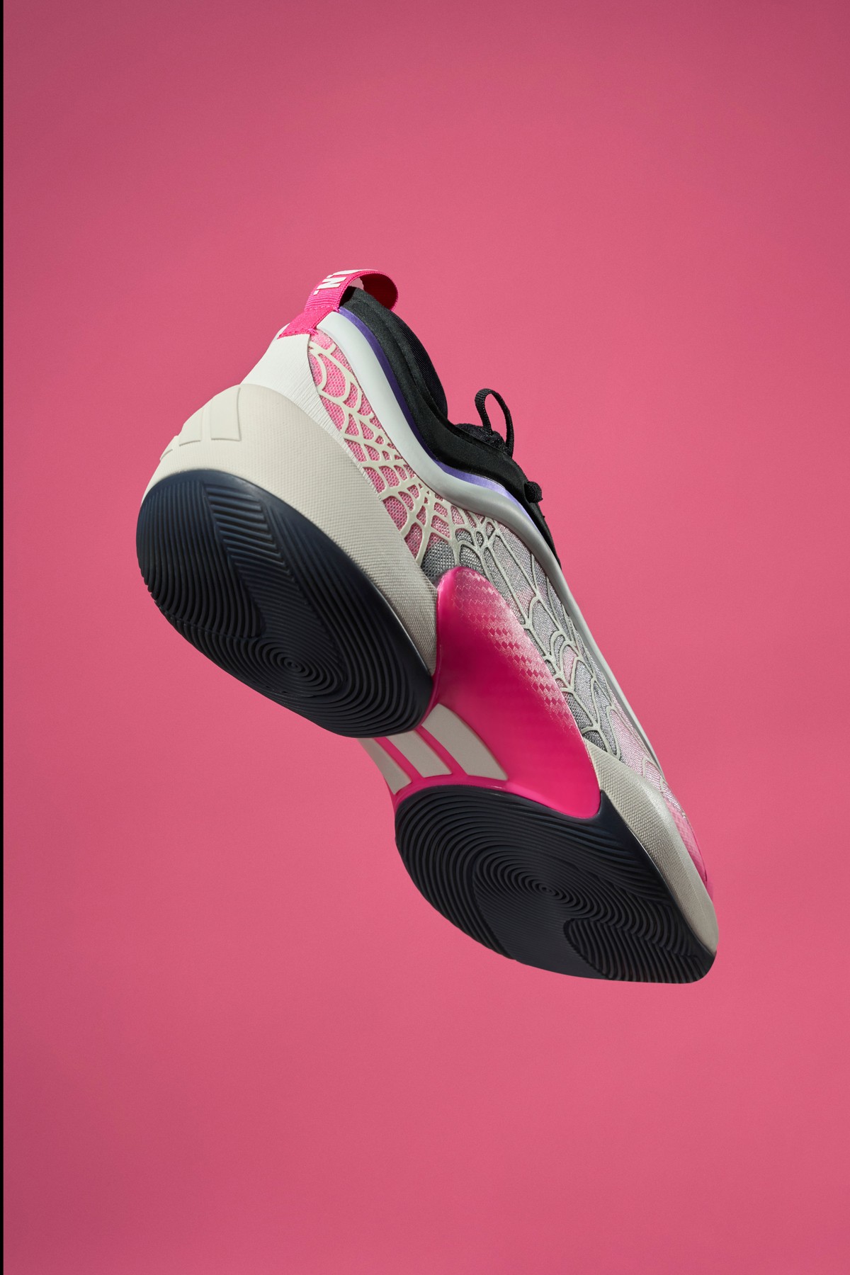 眼前这款全新 adidas D.O.N #6「Halloween Spider」,设计灵感源于米切尔在自己的「71分之夜」时上脚的 D.O.N ISSUE #4 蜘蛛女 Spider Gwen 配色,一方面致敬里程碑式的壮举,另一方面也完美契合万圣节这一主题气氛。