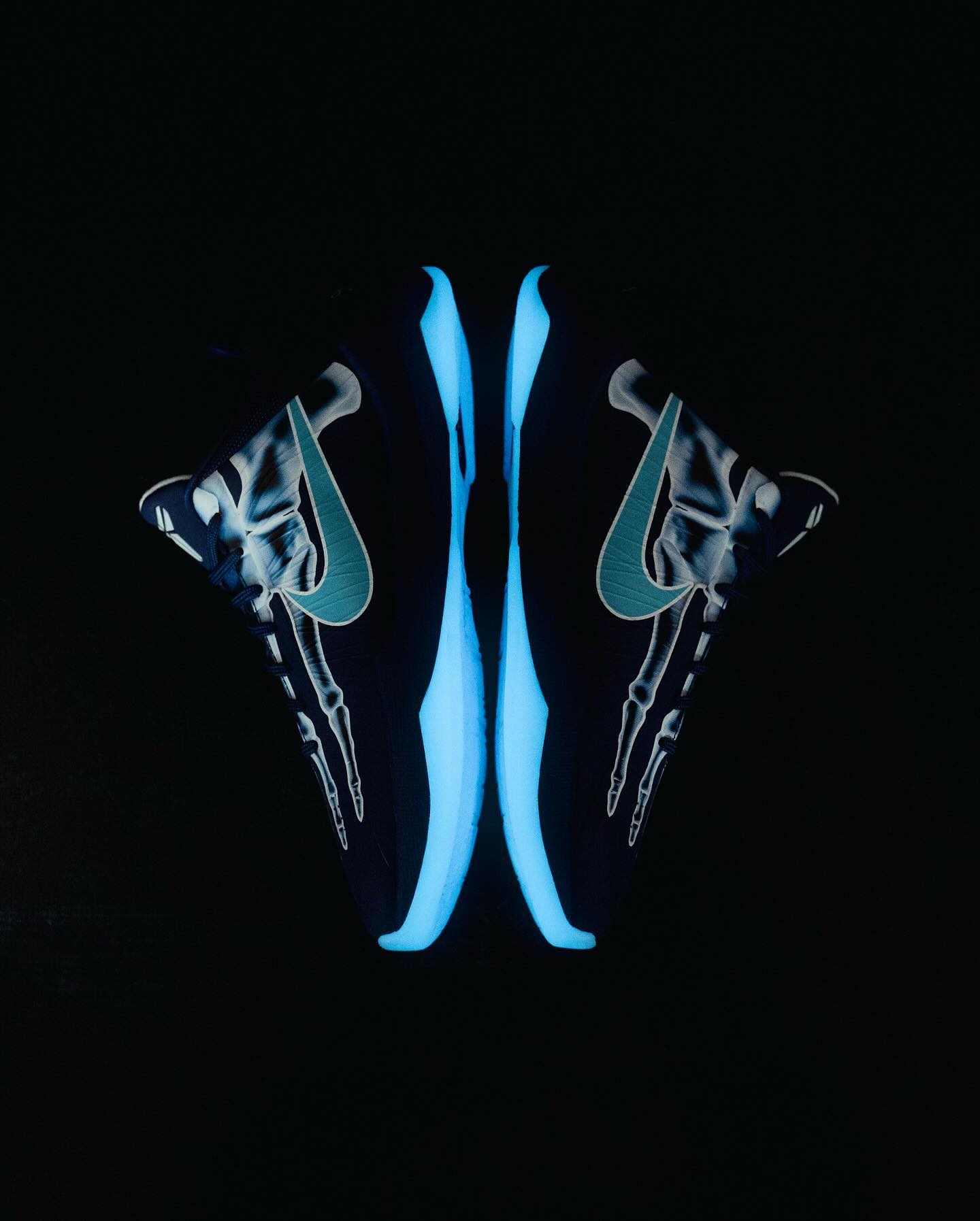 配色灵感相信大家已经很熟悉了,致敬科比当年亲自上身的冠军纪念Tee 为灵感,独特的指骨元素搭配特有的夜光设定,极具视觉冲击。