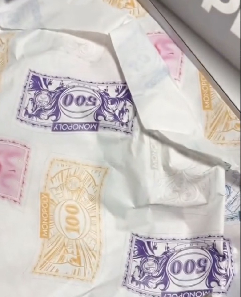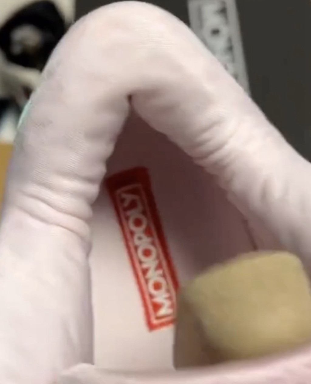 这双是和 Monopoly 联名的配色,整双鞋全部以金钱为灵感,鞋身覆盖大量钞票图案,看起来纸醉金迷。