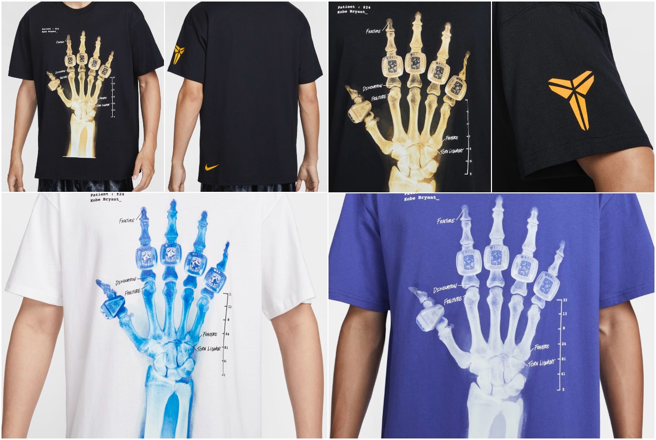 配色灵感相信大家已经很熟悉了,致敬科比当年亲自上身的冠军纪念Tee 为灵感,独特的指骨元素搭配特有的夜光设定,极具视觉冲击。
