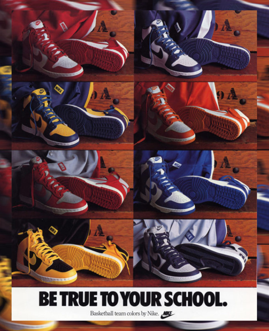 让人想起 1985 年 Nike 当时为 NCAA 八所名校的篮球队设计了专属配色的 Dunk High 系列。