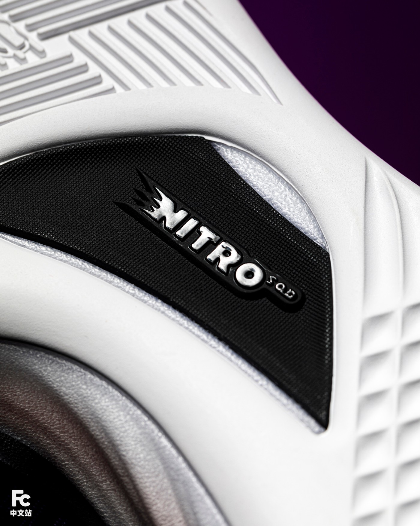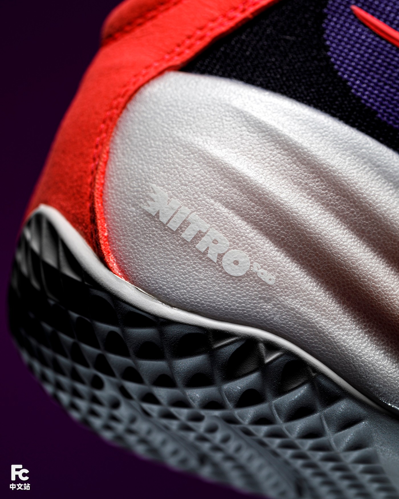 中心位置采用更为柔软的 Nitro 材料提升缓震体验,而在其之外则由更为高密度的 Nitro 材料进行包裹,提供强力回弹反馈的同时保证稳定性。
