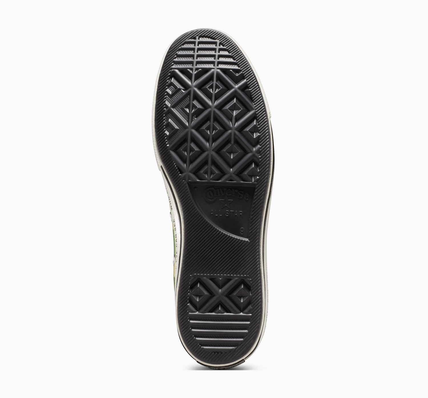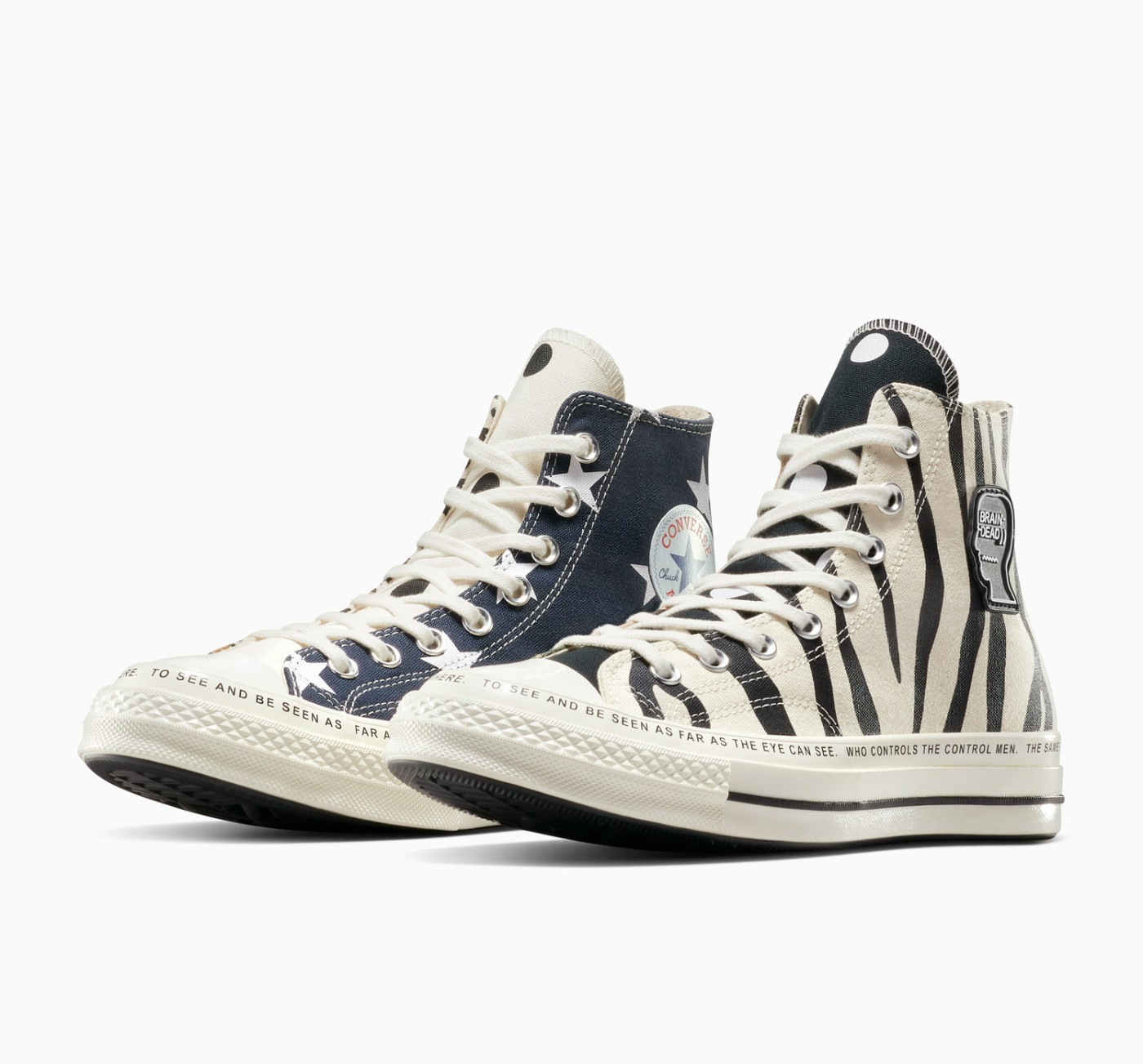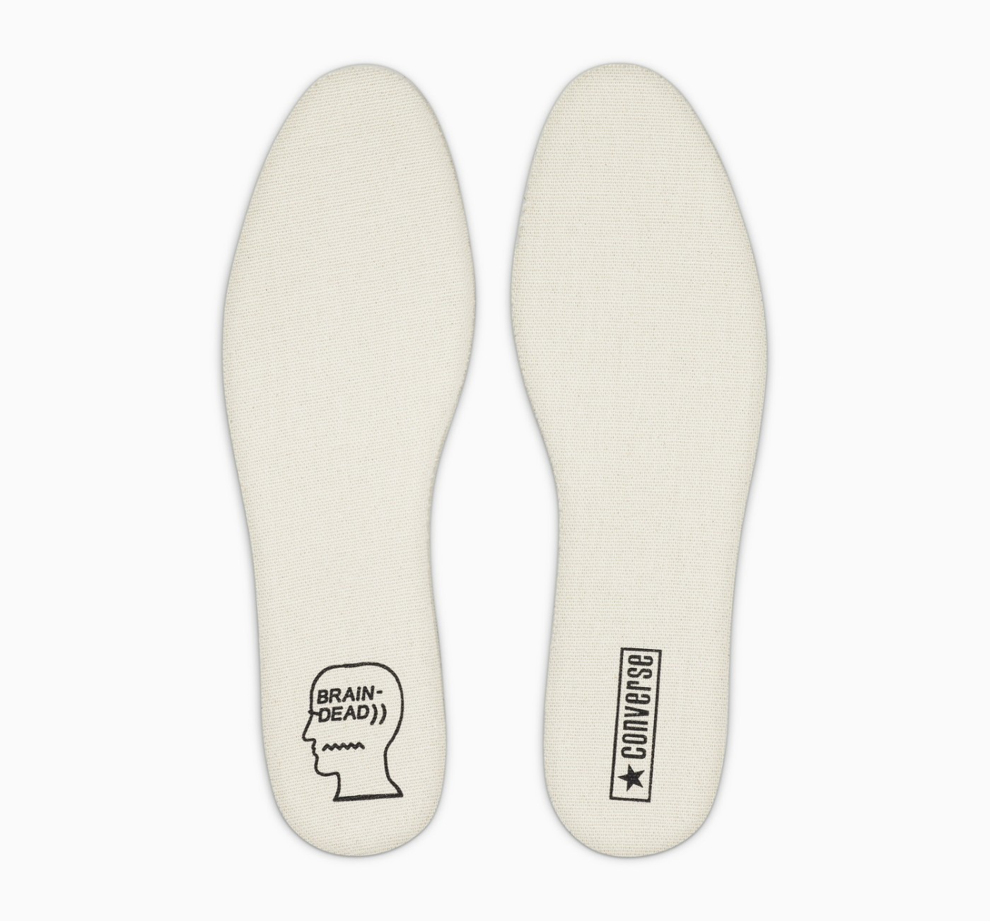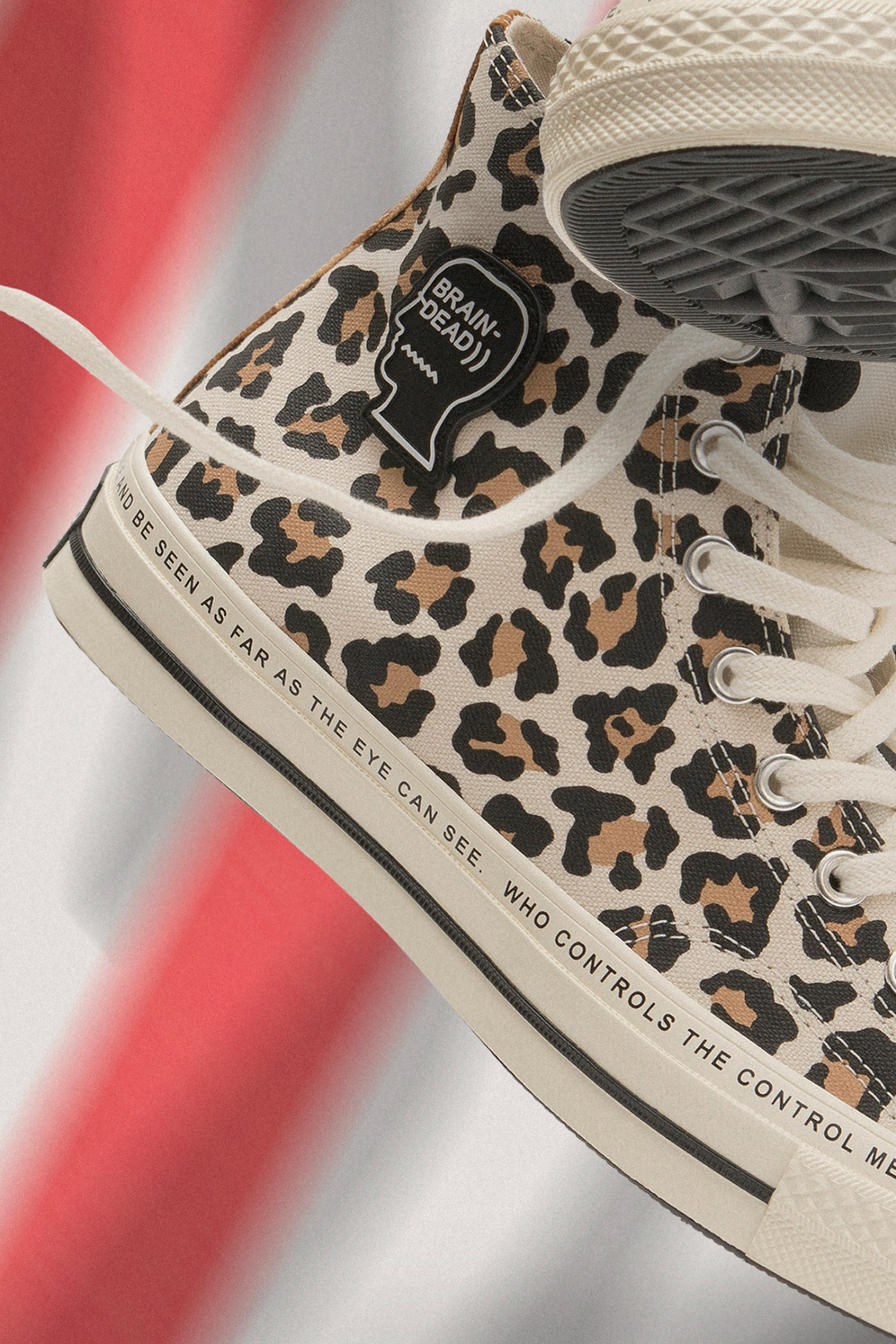 Brain Dead 主理人 Kyle Ng 从朋克、硬核音乐、漫画、滑板等领域汲取灵感,大胆将多种元素混搭在匡威经典 Chuck 70 鞋款中。