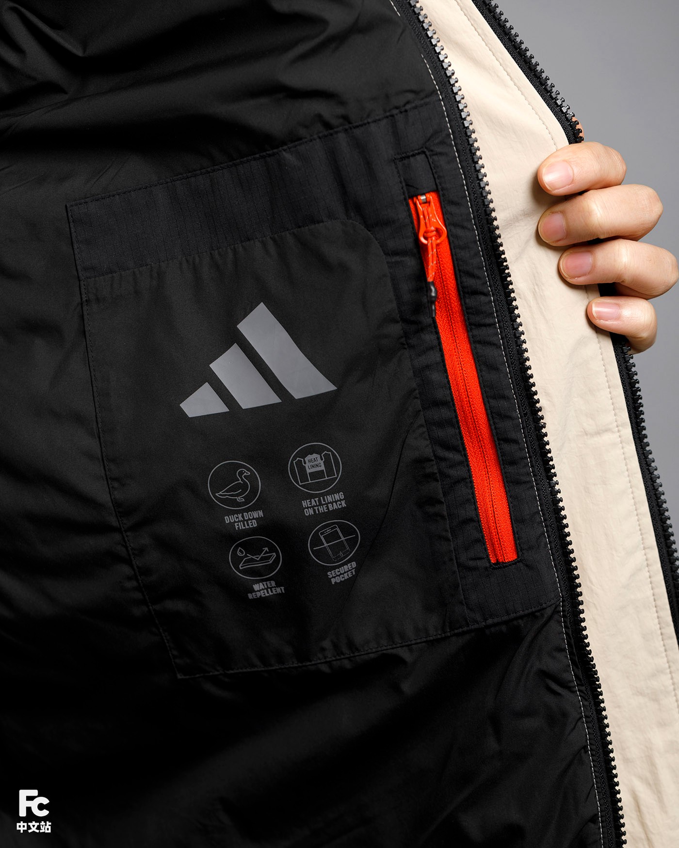 同样是应用了防风防泼水面料,内充 220g 高品质鸭绒,结合碳素纤维面料制成的 “暖芯红温层”。