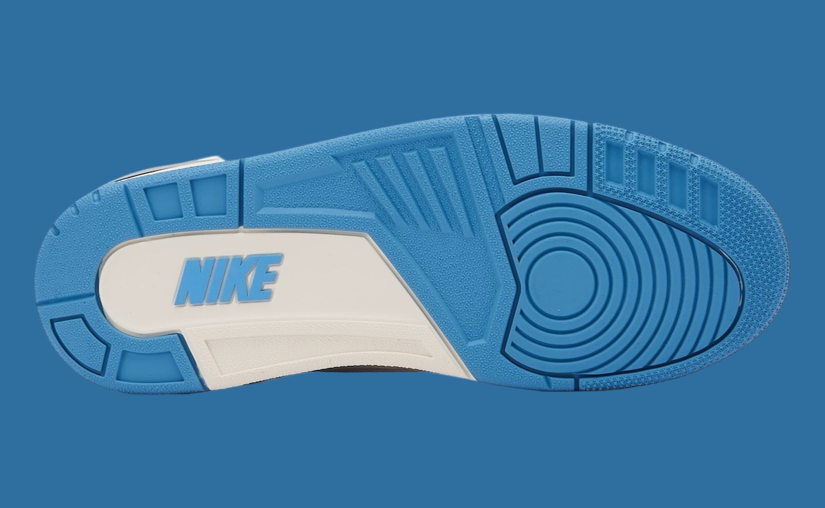 AJ2 标志性后跟「风琴」稳定片与鞋舌飞翼 Logo 则辅以北卡蓝点缀。