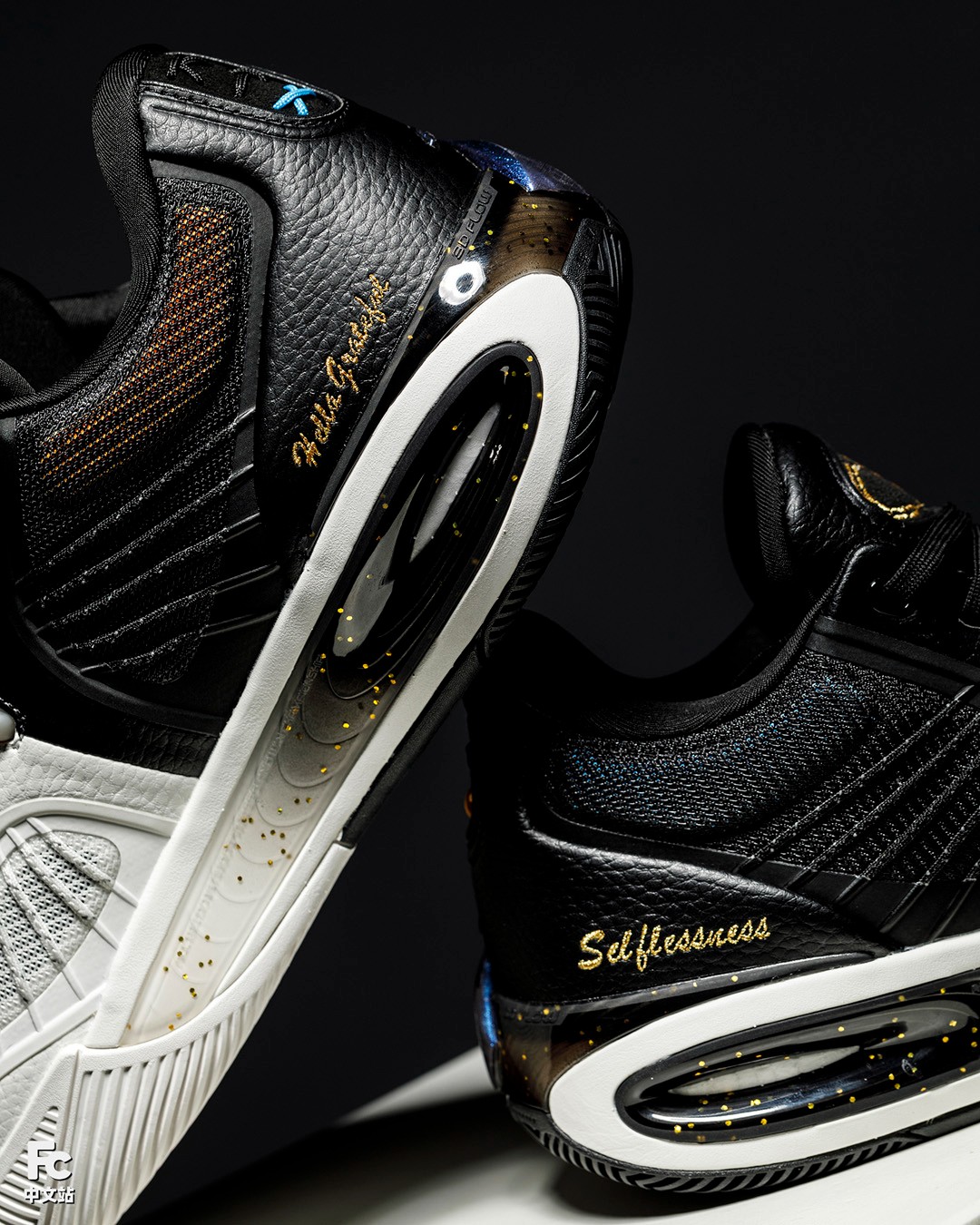 鞋身后侧的金色刺绣也有说法,左边是 “Hella Grateful” 感恩,感恩这十年安踏和汤普森的互相成就,右边是 “Selflessness” 无私,代表着汤普森的篮球理念。