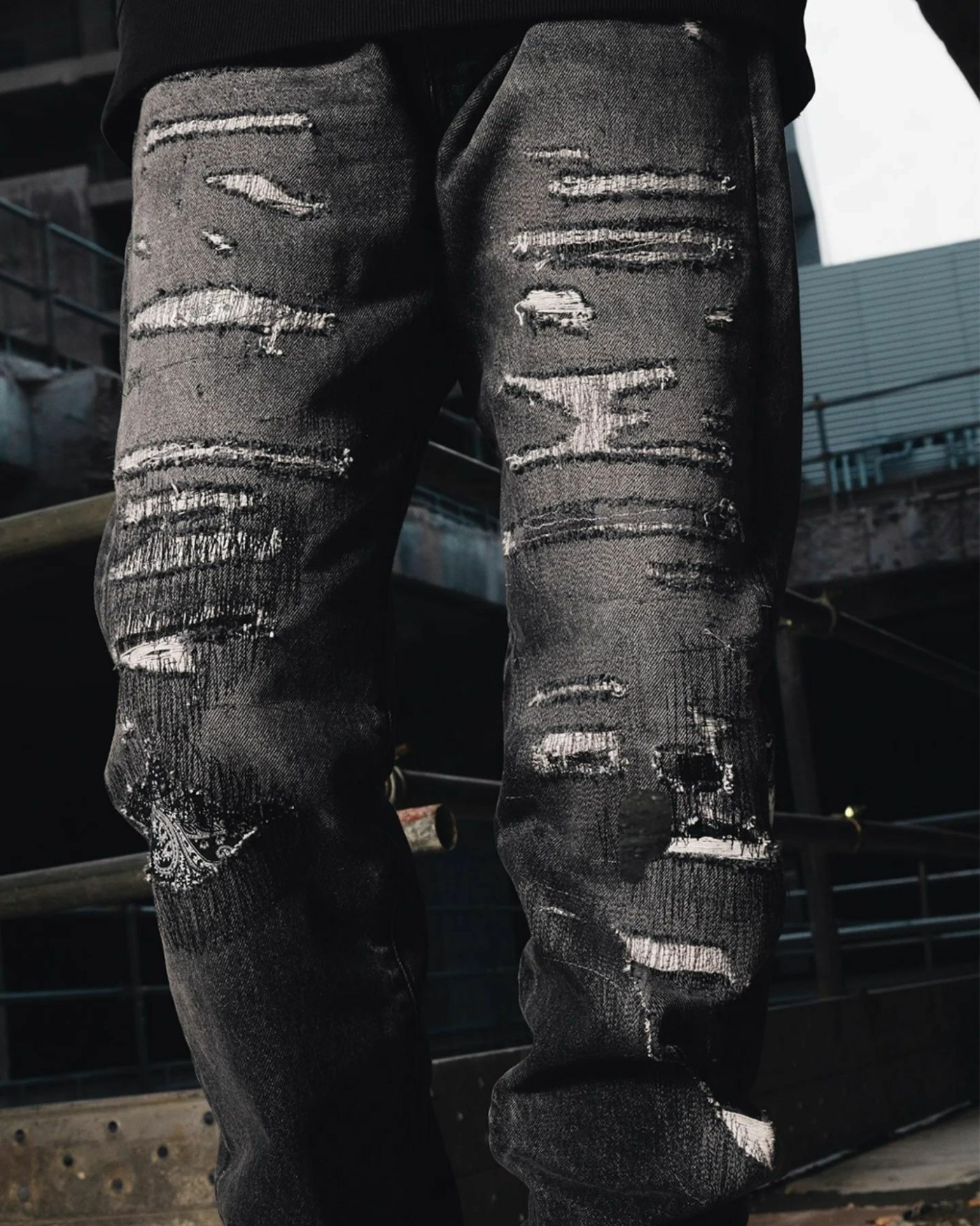 裤子正面大面积破坏细节,赋予街头感同时增加视觉层次。