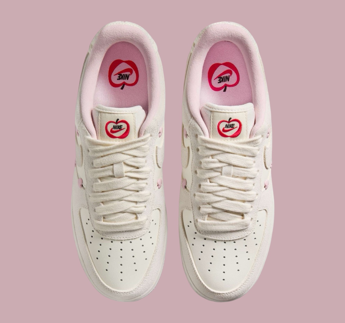 细节方面,鞋舌标签经过全新设计,以刺绣质感的苹果造型呈现,鞋侧还点缀有多颗粉色心形,彰显鞋款身份。