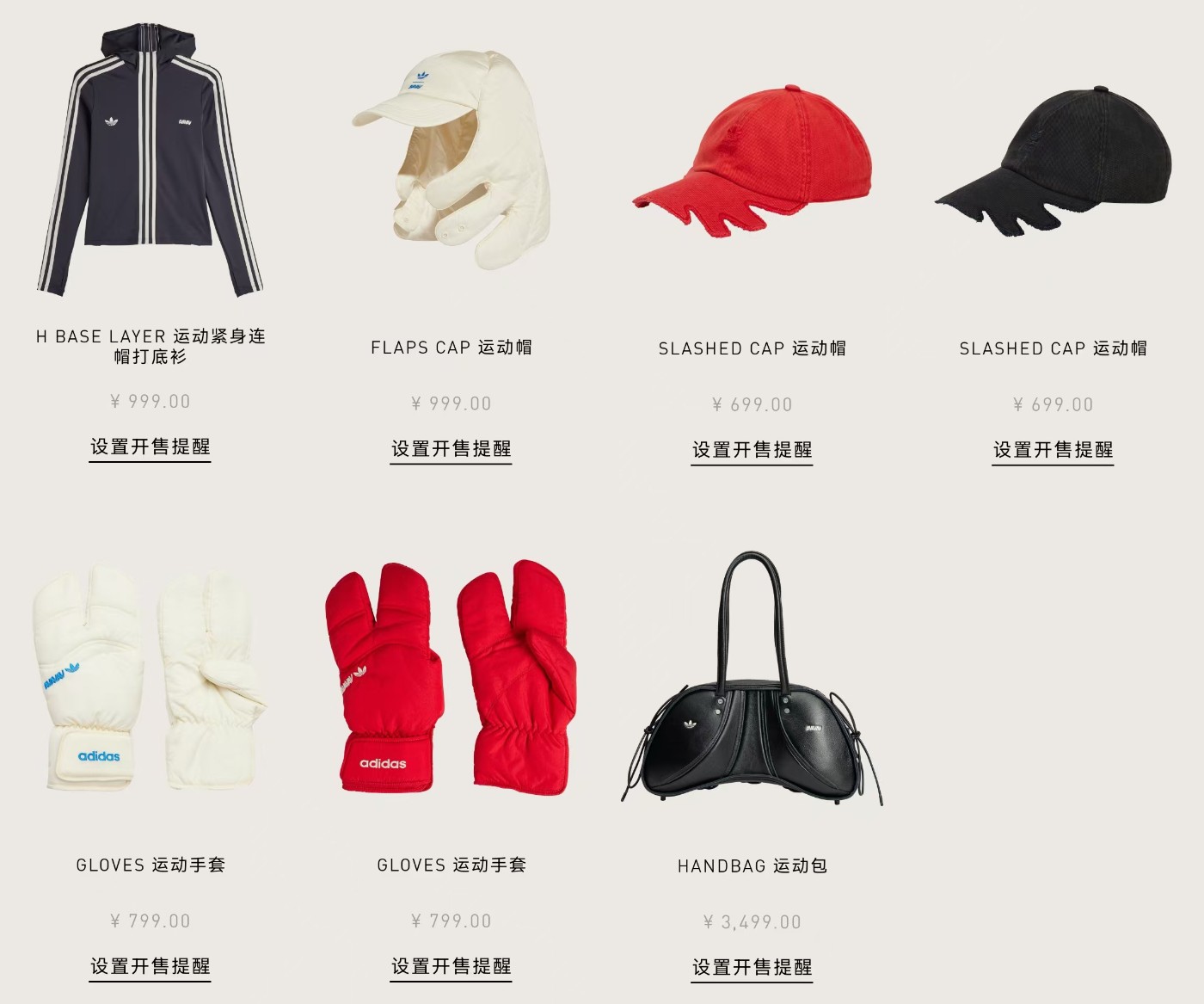 配饰方面也颇具特色,包含了带有手指状切口的帽子、三指足球手套,以及一个同样怪异的 adidas 皮质旅行包。