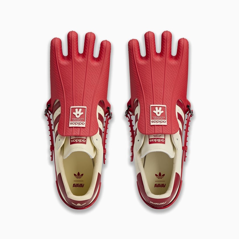 以经典的 Superstar 贝壳头为基础,融入了 Avavav 品牌标志性的元素——四指造型,很有 “鸡爪” 的效果,但它是真的可以穿着和正常行走的!