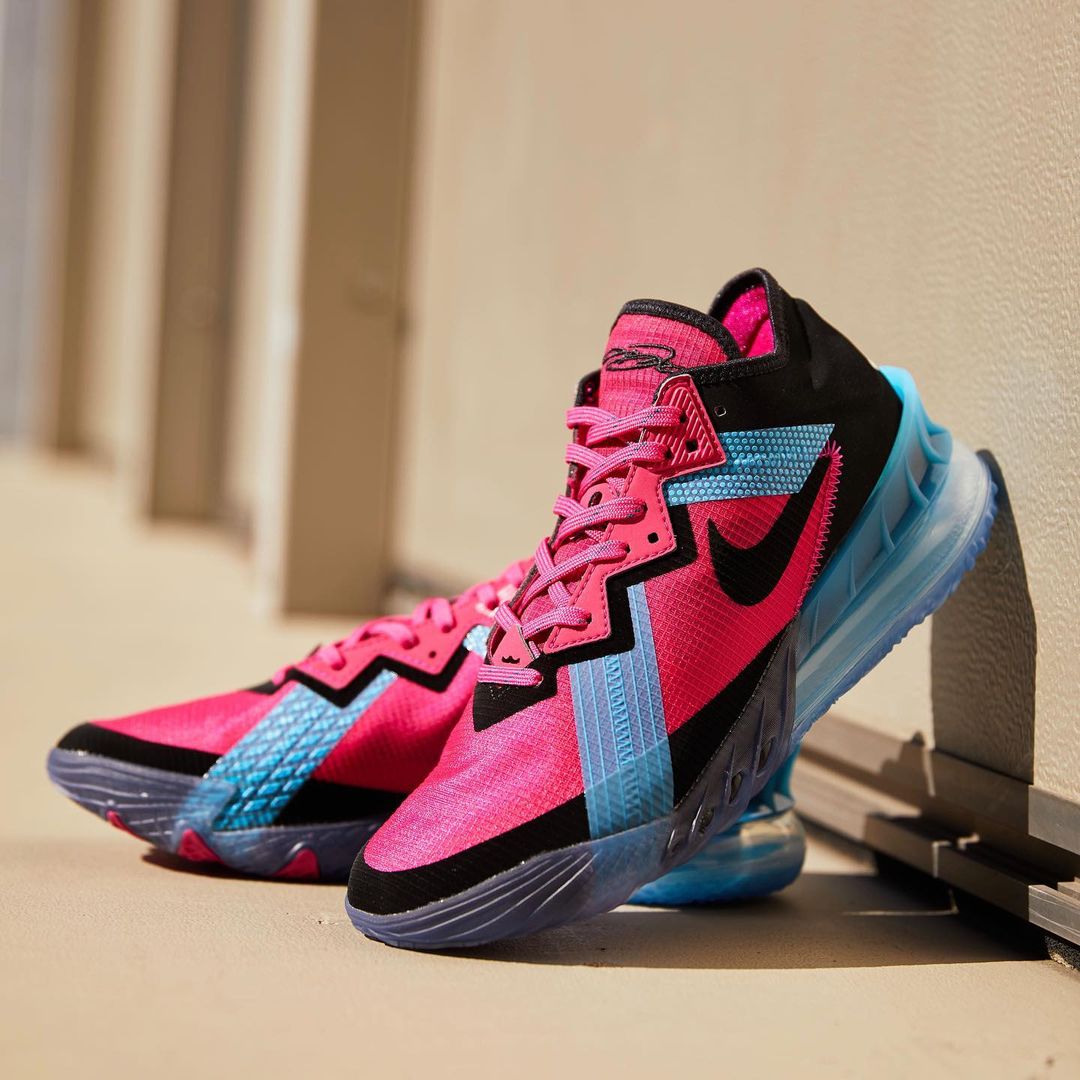 整体依旧延续彻头彻尾的粉色与湖水绿装扮,在这一代 LBJ22 鲜明层次的鞋身轮廓下,释放出极高辨识度。