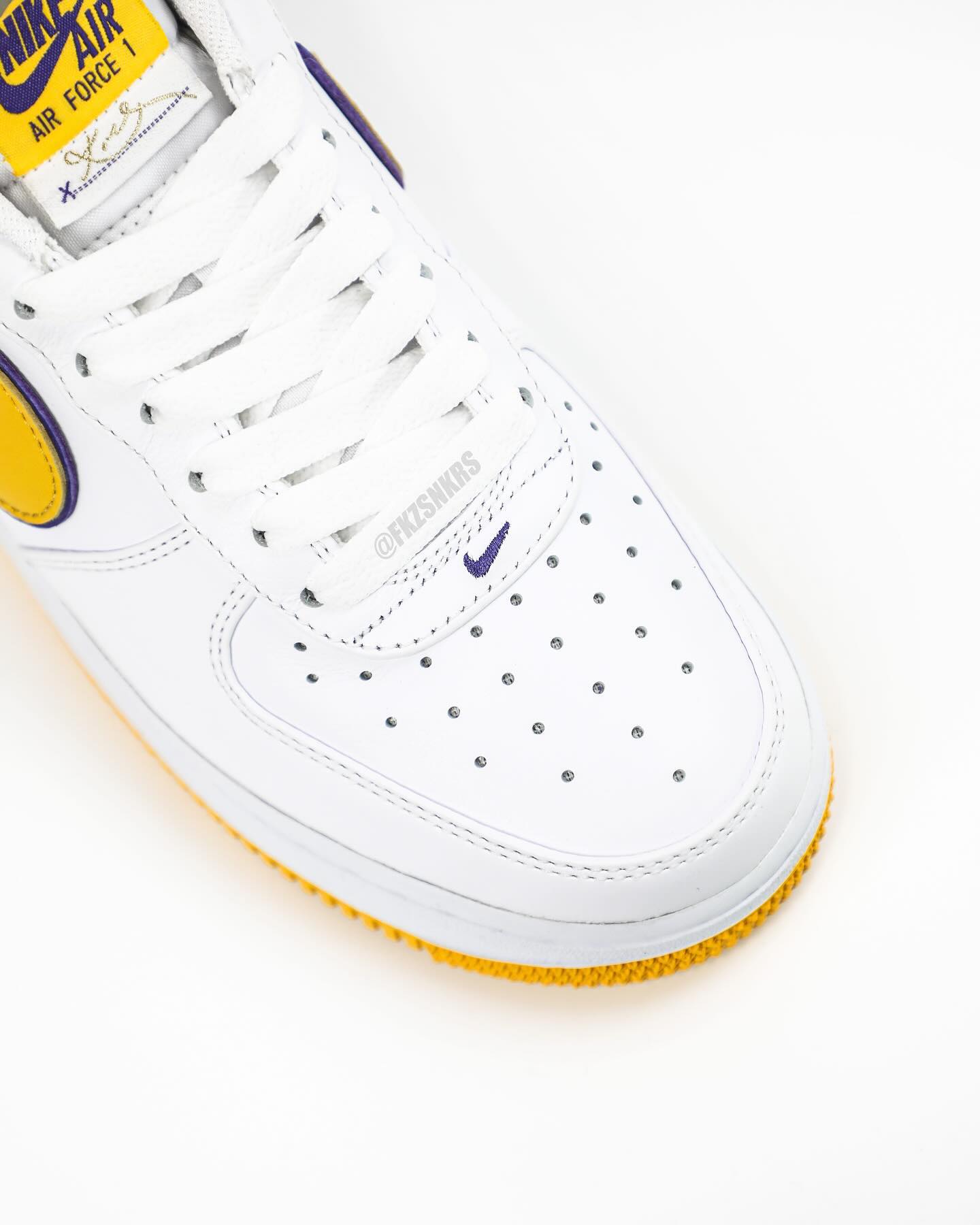 配色主题源于科比 “乱穿鞋” 时期,在球场上穿过一双 Air Force 1,白色打底呈现了湖人队配色,而此时科比的球衣号码也是最初的 8 号。