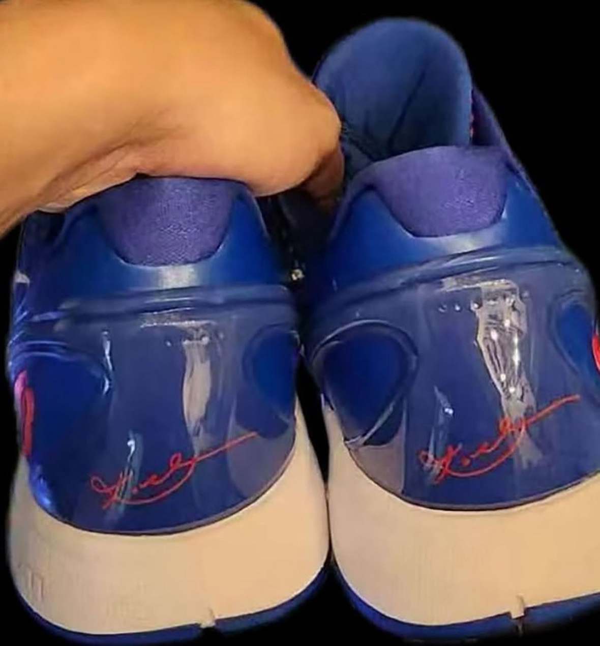 不过目前曝光的市售版本,可以看出后跟的 TPU 稳定片与鞋带部分,并非是最早科比女儿上脚的白色。