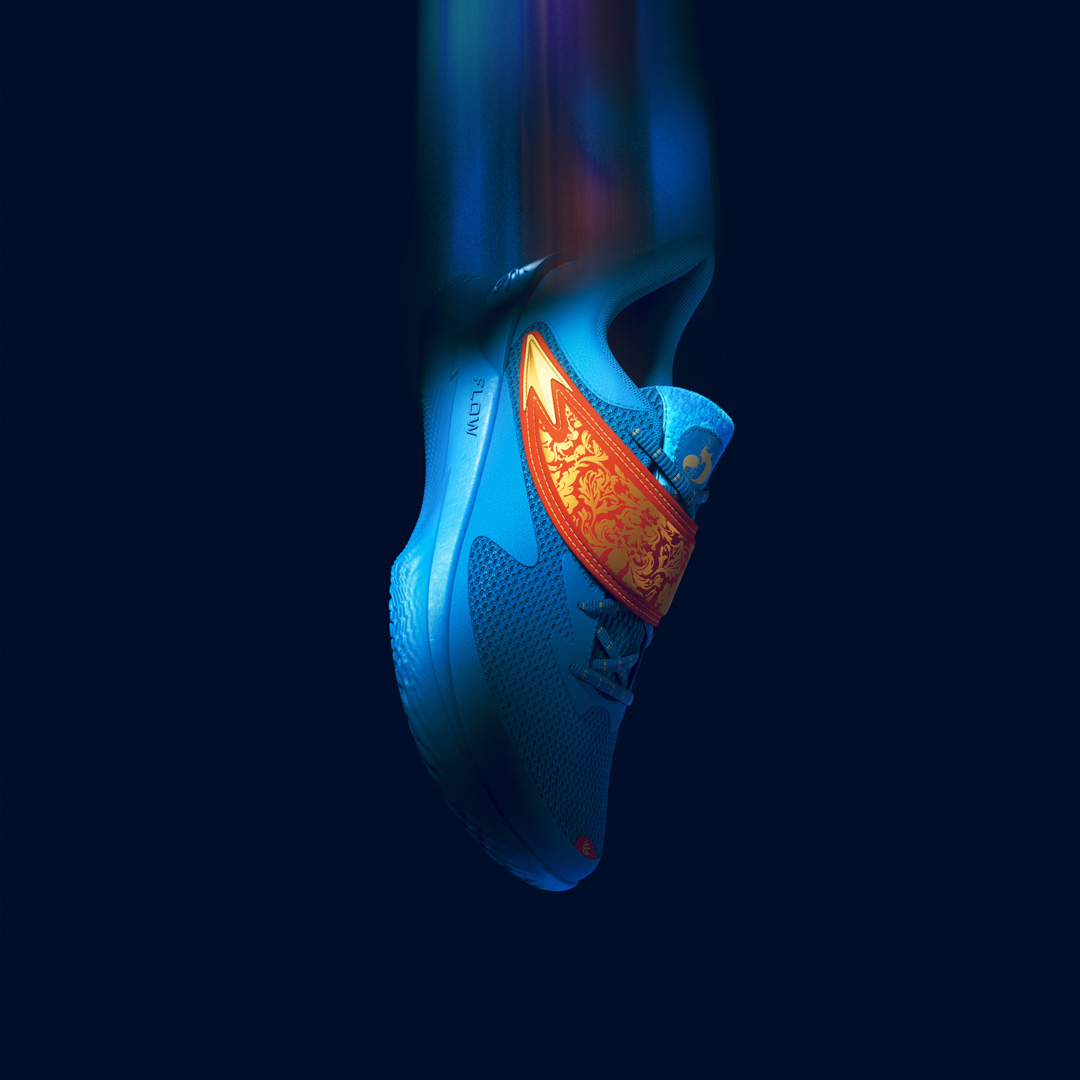 锯齿形侧墙设计灵感来源于福克斯对动漫文化的热爱,强调了鞋款的速度主题,绒毛鞋舌细节和球员专属 Logo 则彰显了他的独特风格。
