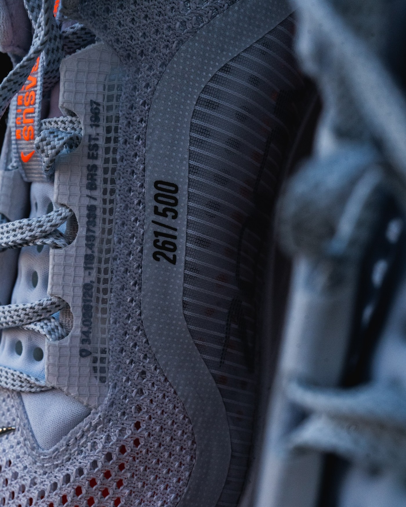鞋身与官宣曝光时,在内侧多了一个限量 500 双的独立编号,中底还额外刻印有对应的缓震科技名称。