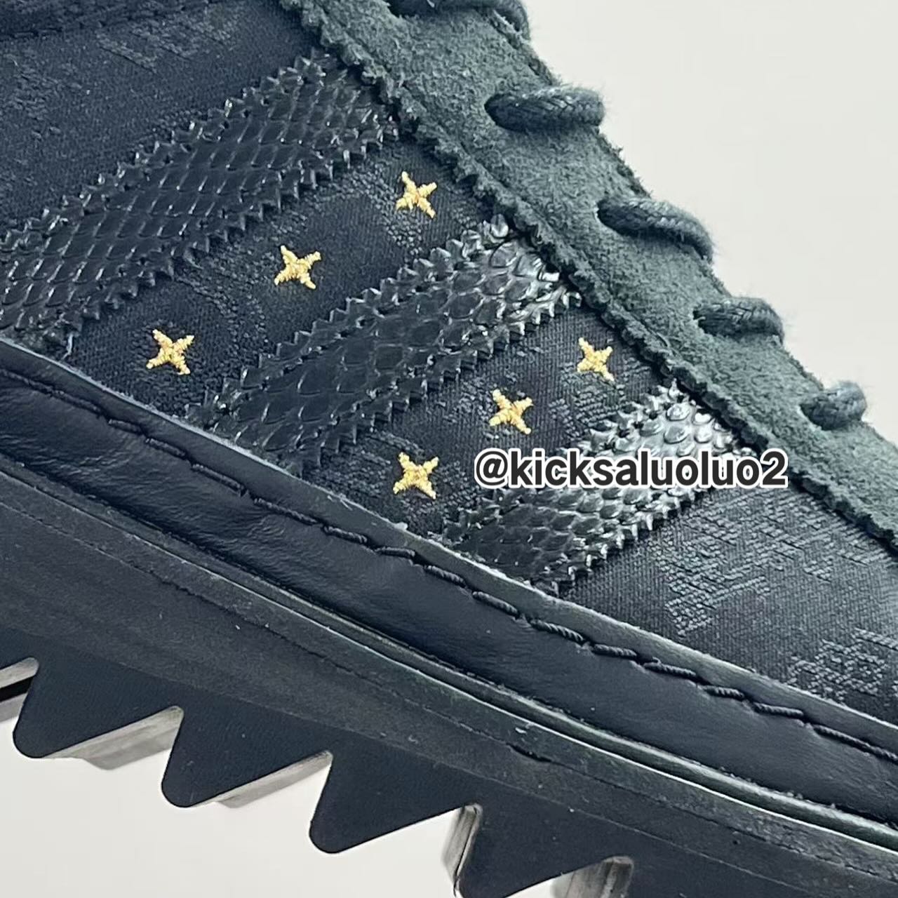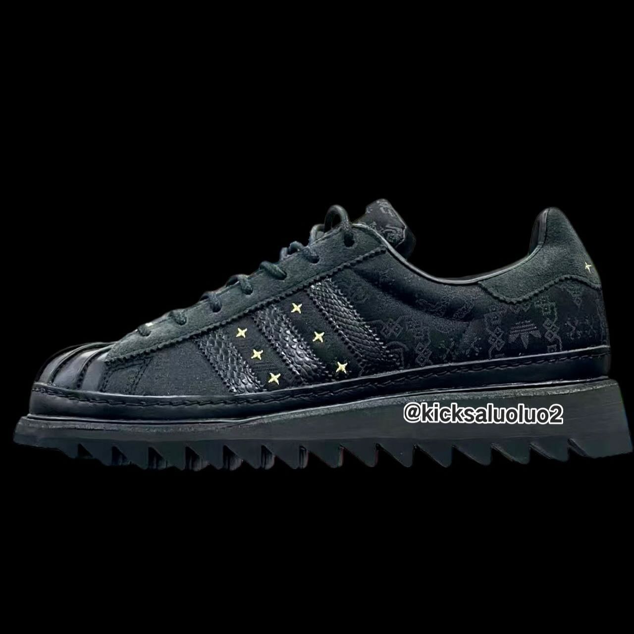 整双鞋以黑色贯穿,辅以金色的细节点缀,鞋面纹理则是熟悉的中国国风,同时呈现了三叶草 LOGO 和 CLOT 标志,鞋带扣上的「蛇」字表明了它的配色主题。