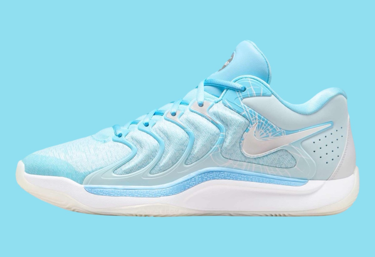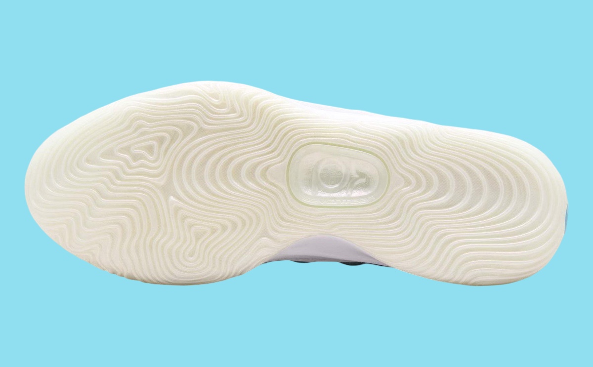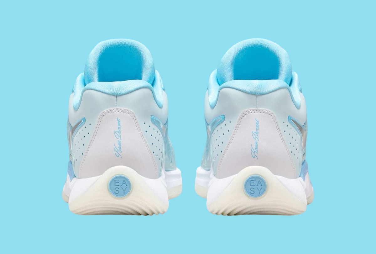 整体白蓝的清爽过渡,营造圣诞冰雪的节日主题,鞋侧冰层破裂的细节,则传递杜兰特赛场力挽狂澜的韧性。