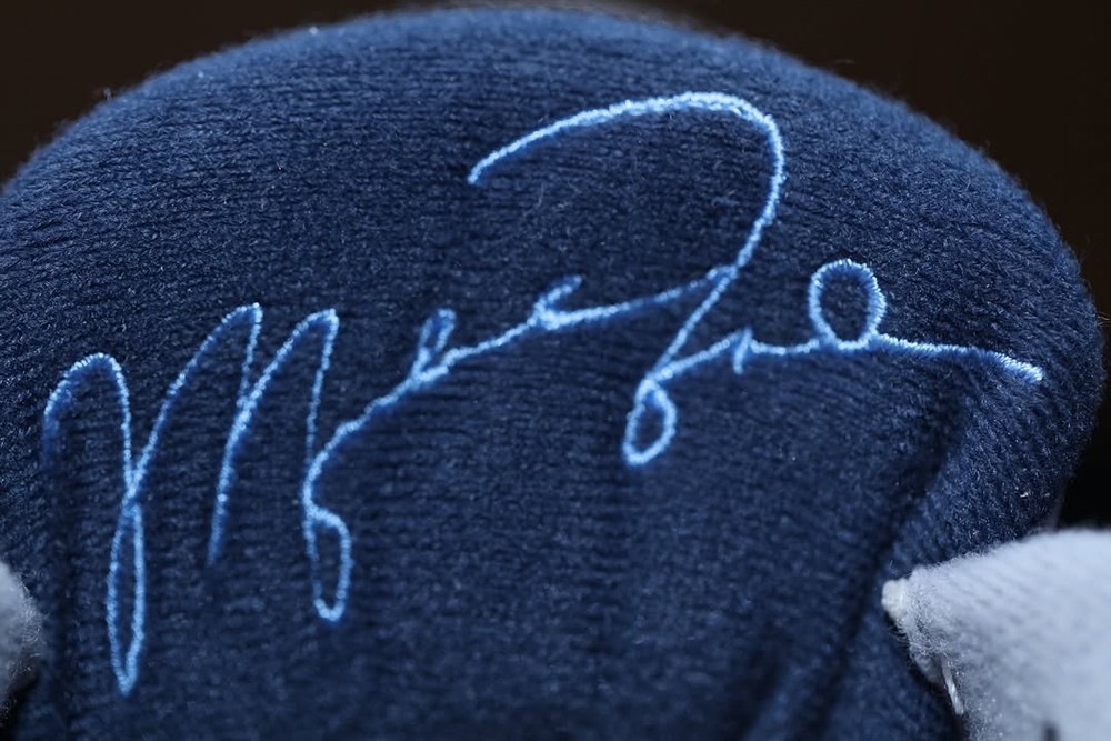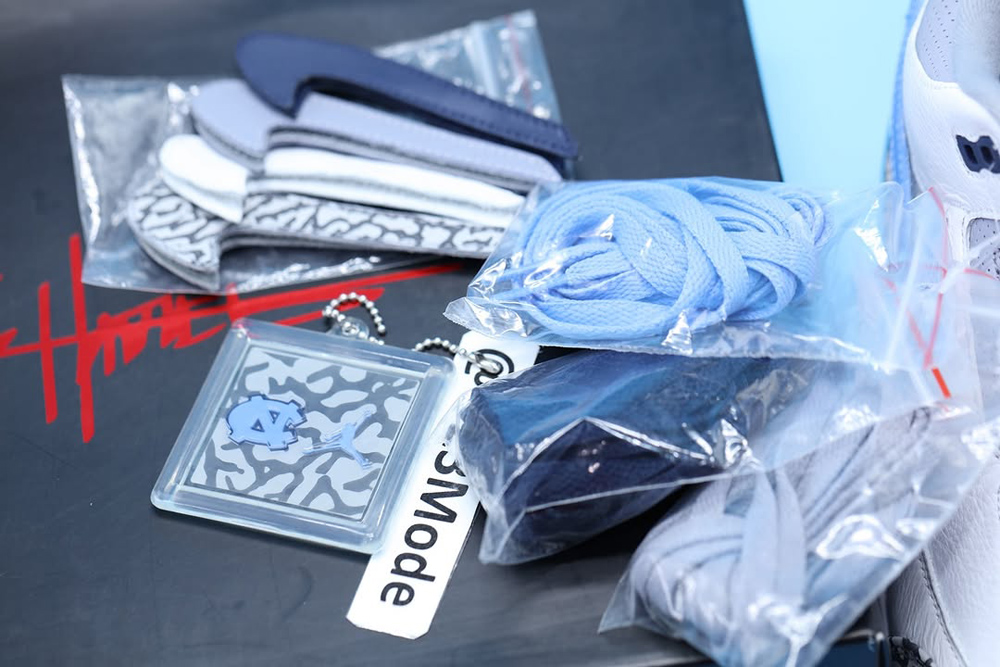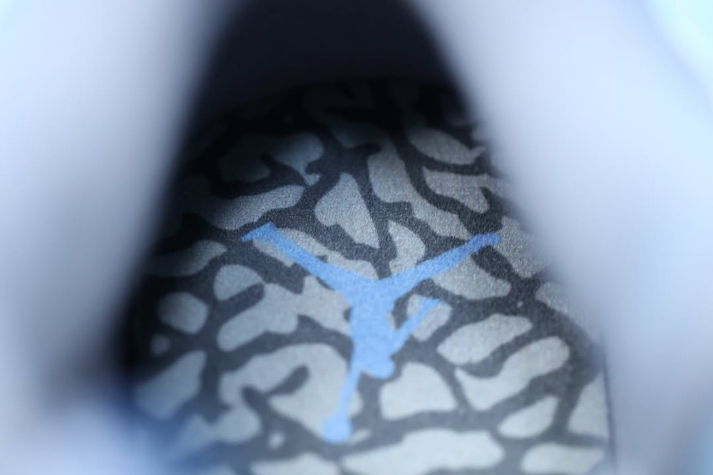 最吸睛的还是后跟位置的 UNC 北卡 Logo 与 Jumpman 跳跳人标志,以及附赠的北卡爆裂纹吊牌。