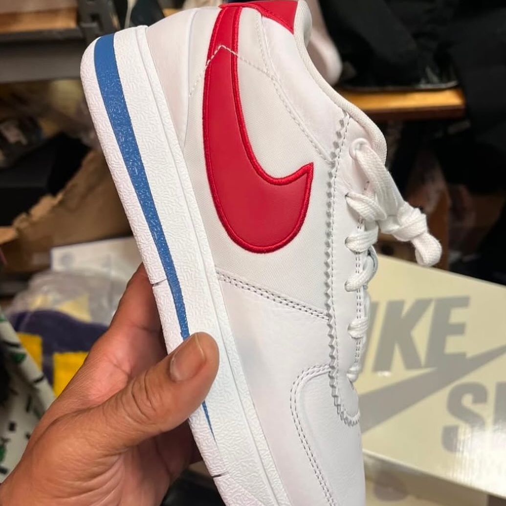 目前看整体构色方案与 PE 版本一致,不过市售版本的鞋侧为类似 Cortez 的尼龙,Swoosh 边缘采用红色车线勾勒。