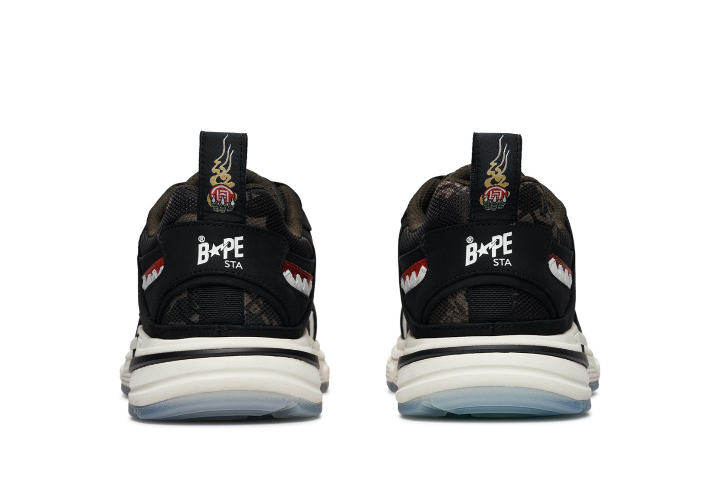 本次联名鞋款选择以 SHARK STA 为蓝本,鞋面外观融入 BAPE® 迷彩图案与 CLOT 经典标识,定价为¥2499 元。