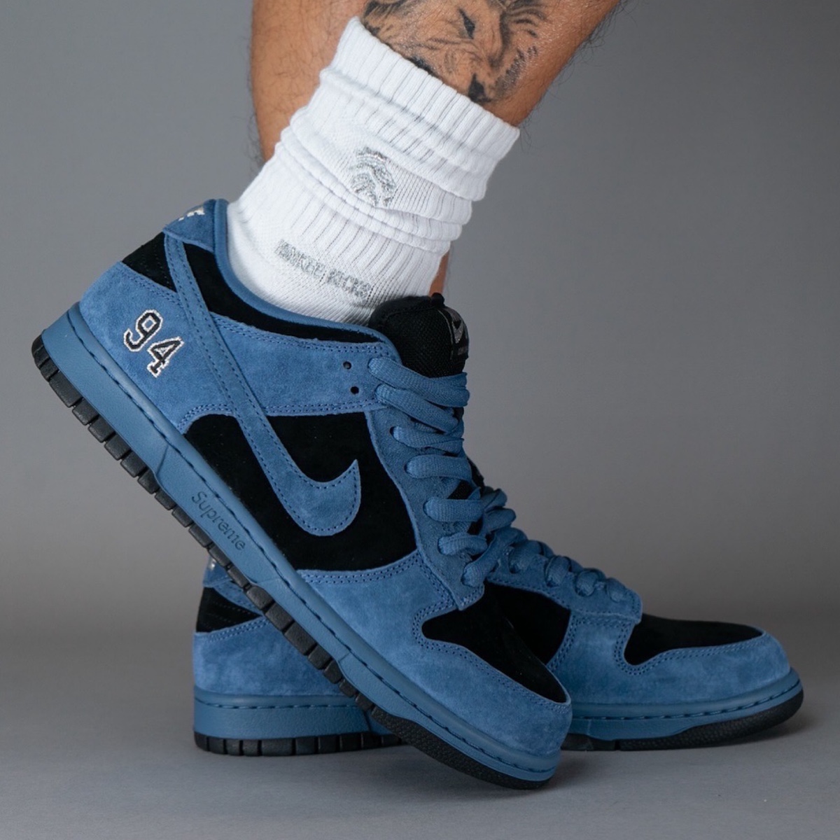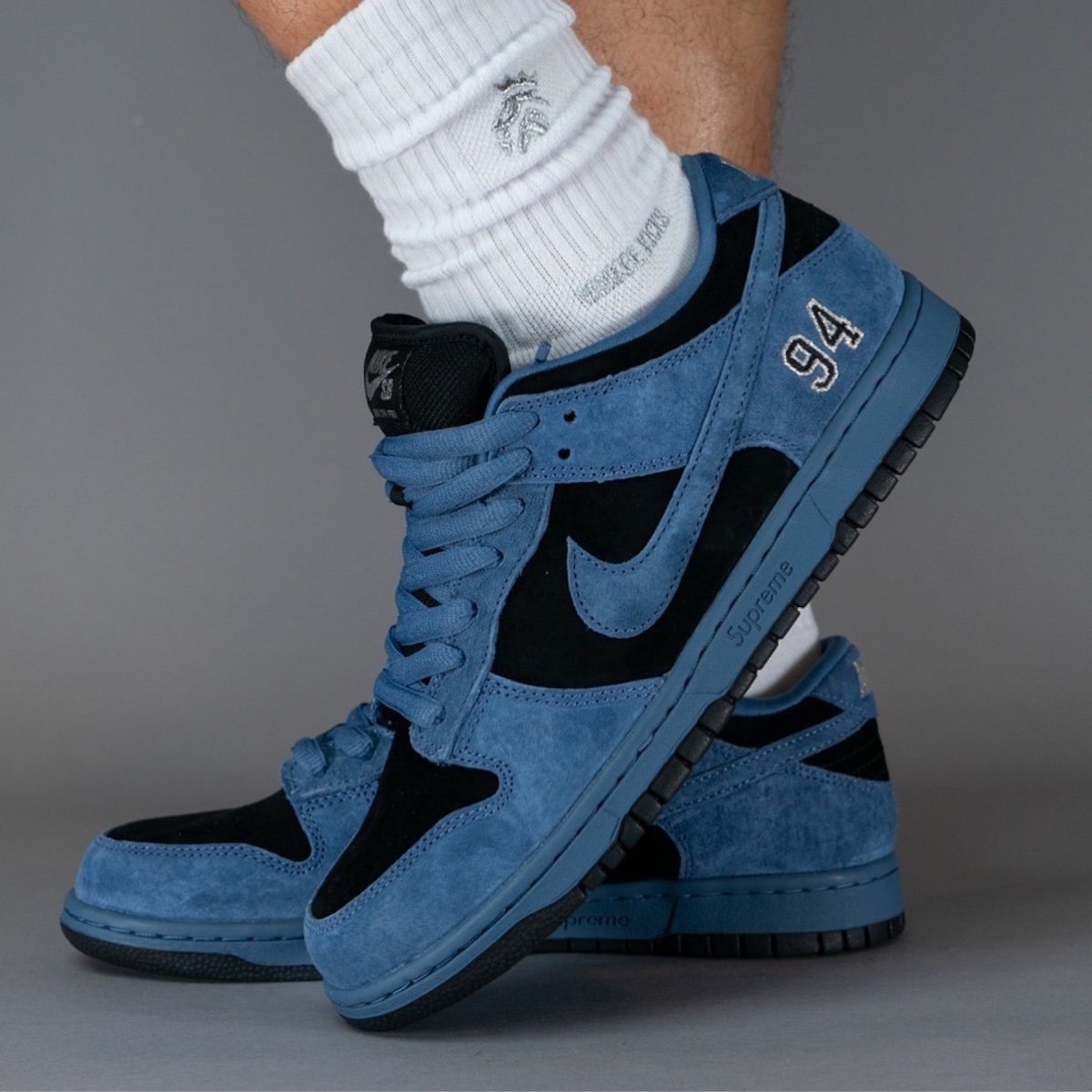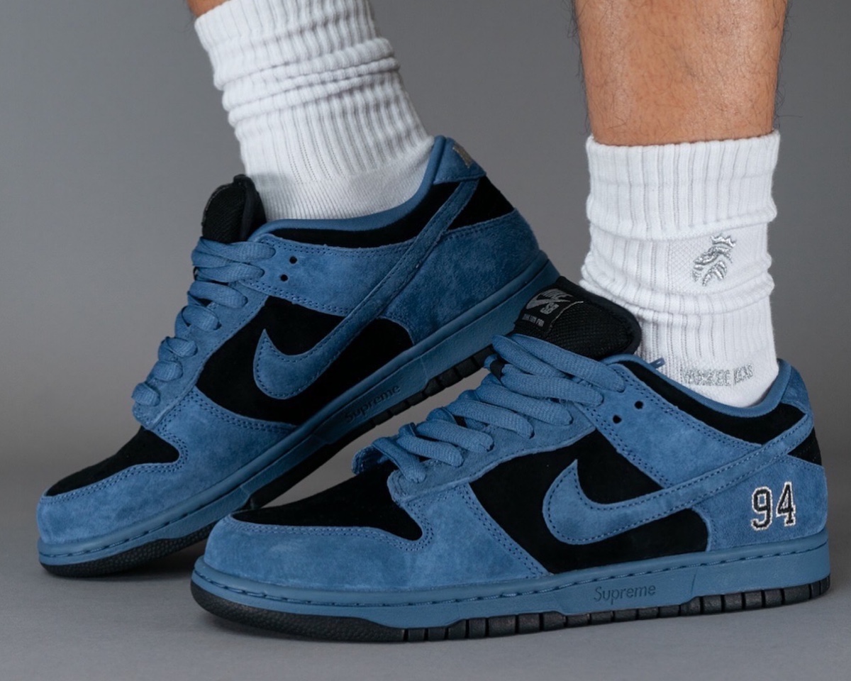 这段时间 Supreme x Nike SB Dunk Low 的实物接连释出,刚刚 “Ocean Fog” 配色迎来一组上脚图。
