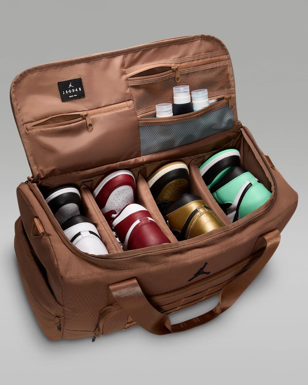 作为一名鞋迷,谁不想拥有一个 PJ·塔克那样的鞋包呢?出门旅行也能每天不重样地穿,实在太爽。 没想到 Jordan Brand 官方还真就带来了官方产品,尽管没有鞋王的那么大,但更适合咱们普通玩家。 可以看到包包最多容纳四双鞋,对于一周左右的短途旅行那肯定是足够了。 每一双鞋都分格独立保存,此外还有额外空间来存放球鞋清洁工具。 最关键的是,包包可以让球鞋和其他行李分隔开,保证卫生。 这次除了黑色,还有卡其色推出,不知道哪个是你的菜呢?