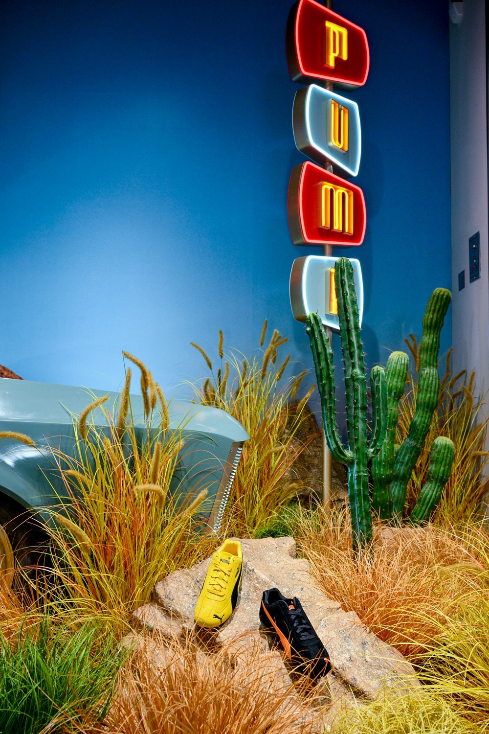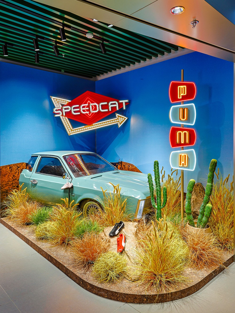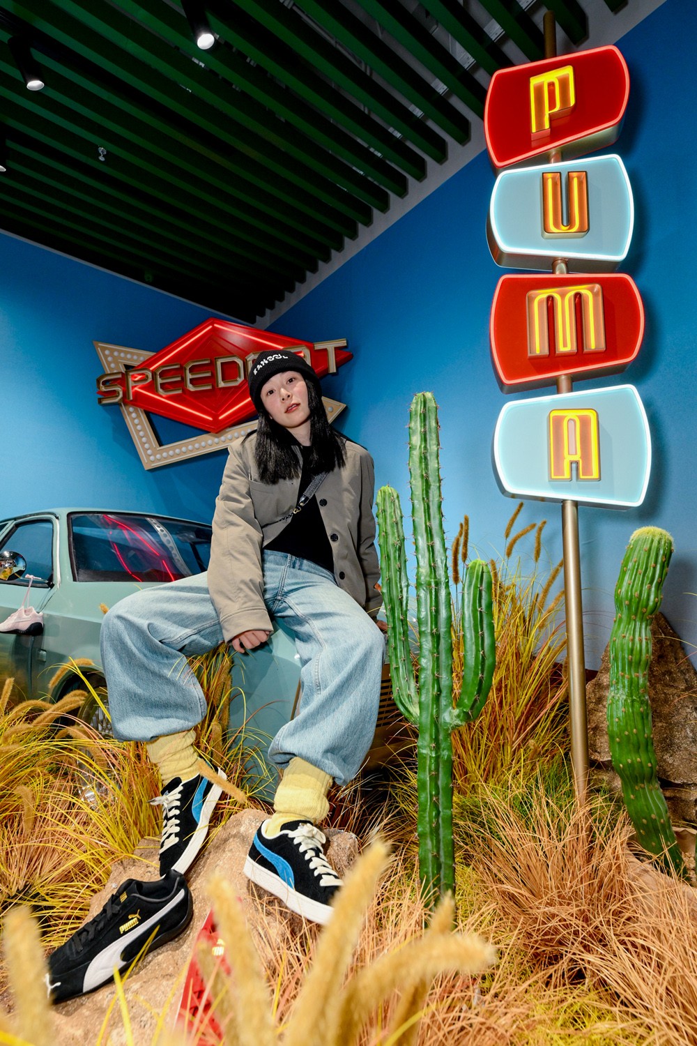 门店入口处还特别打造 Speedcat 主题展示区,从全球品牌代言人 Rosé 的最新公路大片中汲取灵感,仿佛穿梭在开阔的高速公路与山脉之间,感受自由驰骋的快感。