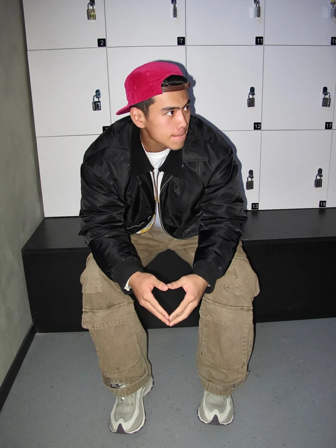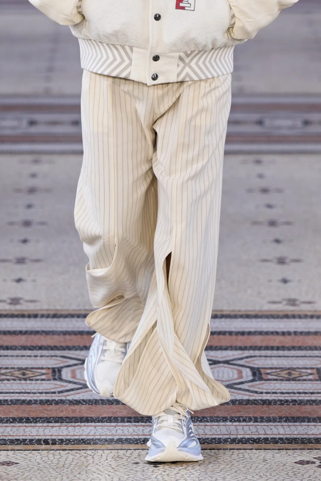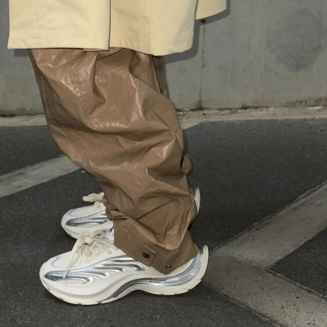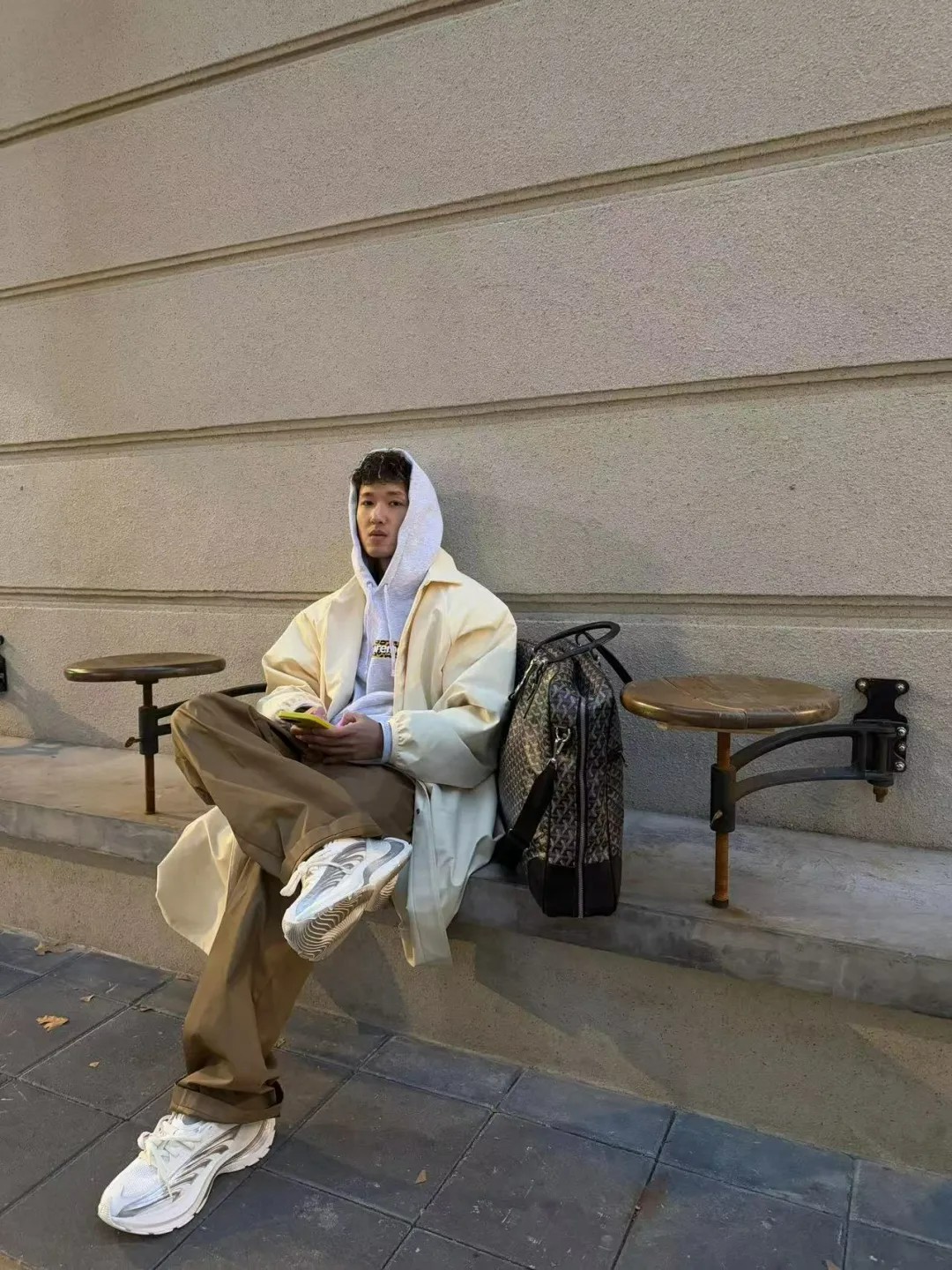 他选用廓形长裤搭配,裤腿处自然堆叠形成的层次与立体感,展现出属于 Y3K 风格的动态美感。