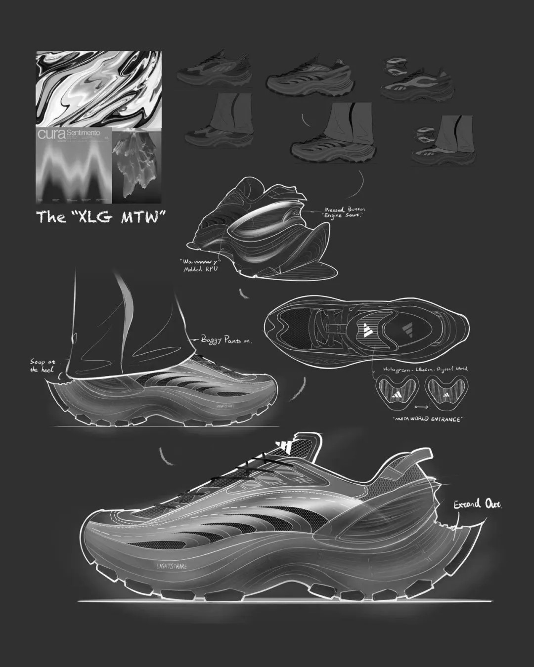 设计灵感来源于鞋款在受到 Metaworld 中的电子脉冲 Wave 影响而产生的想象,XLG 是 “X-Large” 加大号的意思,MTW 则是 “METAWAVE” 脉冲的简写。