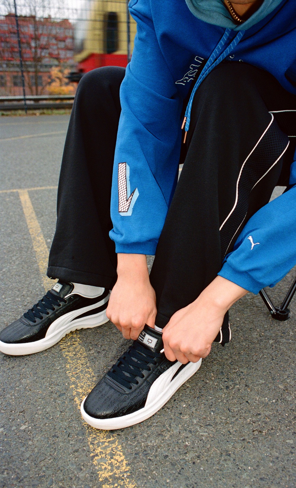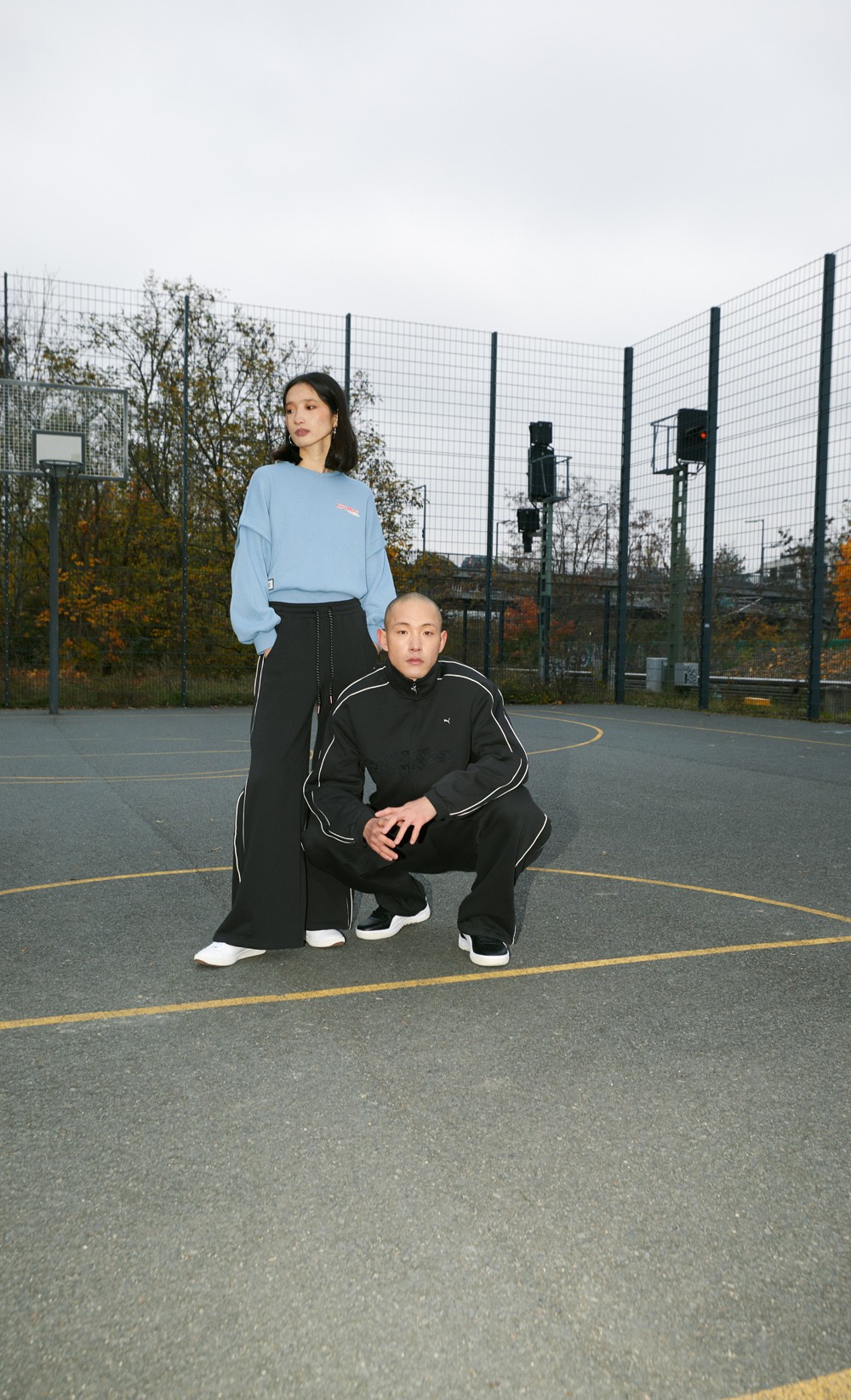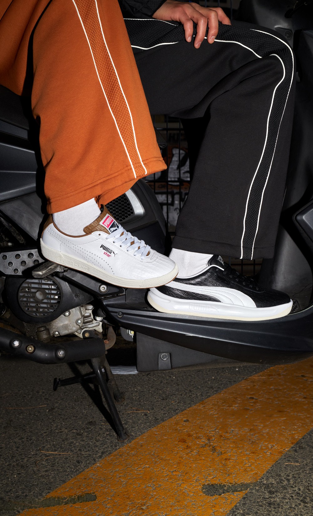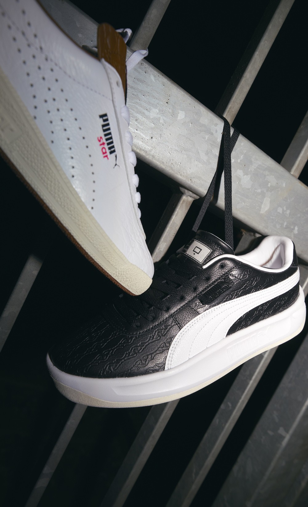 联名鞋款方面,分别采用黑、白为主调,鞋身注入街头篮球场常见的铁网印花呈现,结合柔软的皮质内衬及专属联名篮板标识,兼顾出色质感与鲜明的街头气质。