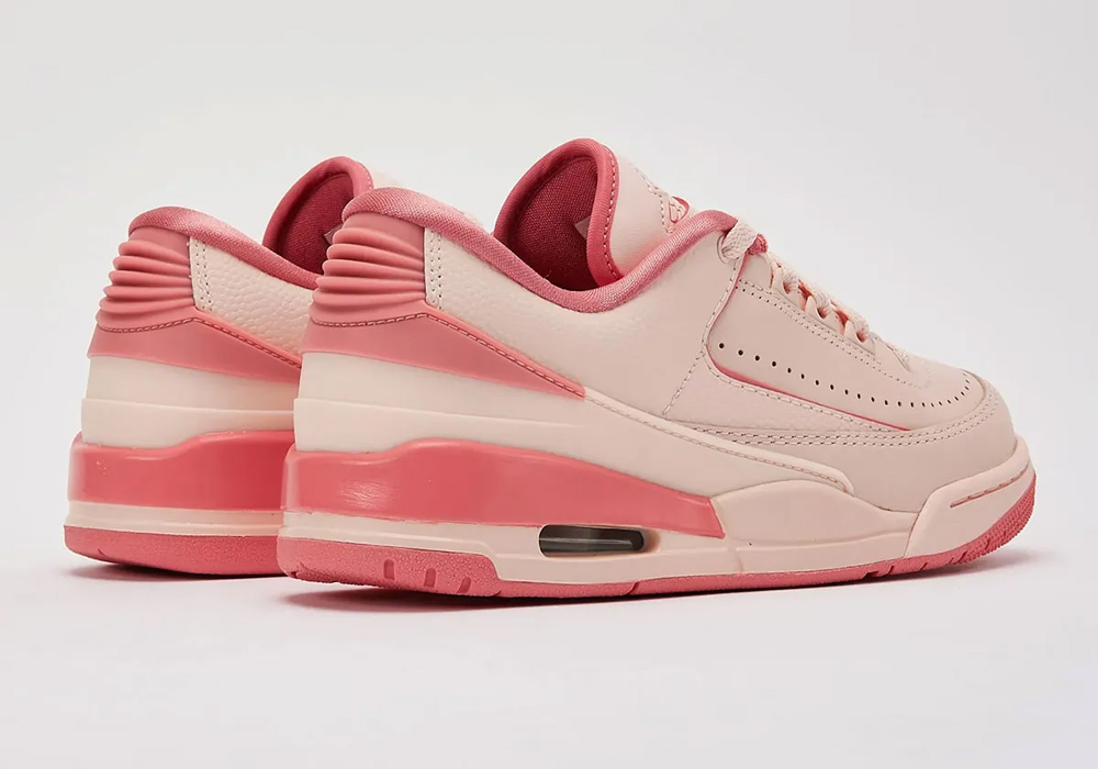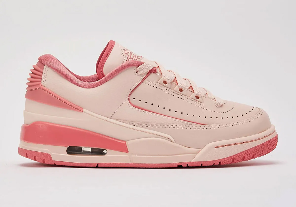鞋身采用粉色与珊瑚色共同营造,完美中和了 Jordan 2/3 合体鞋难以避免的割裂感,复古氛围之下,散发出清新的活力气质。