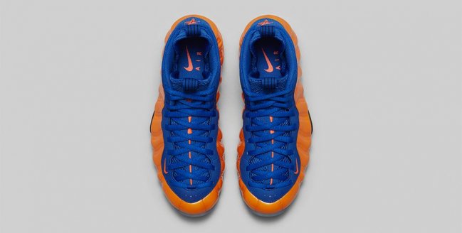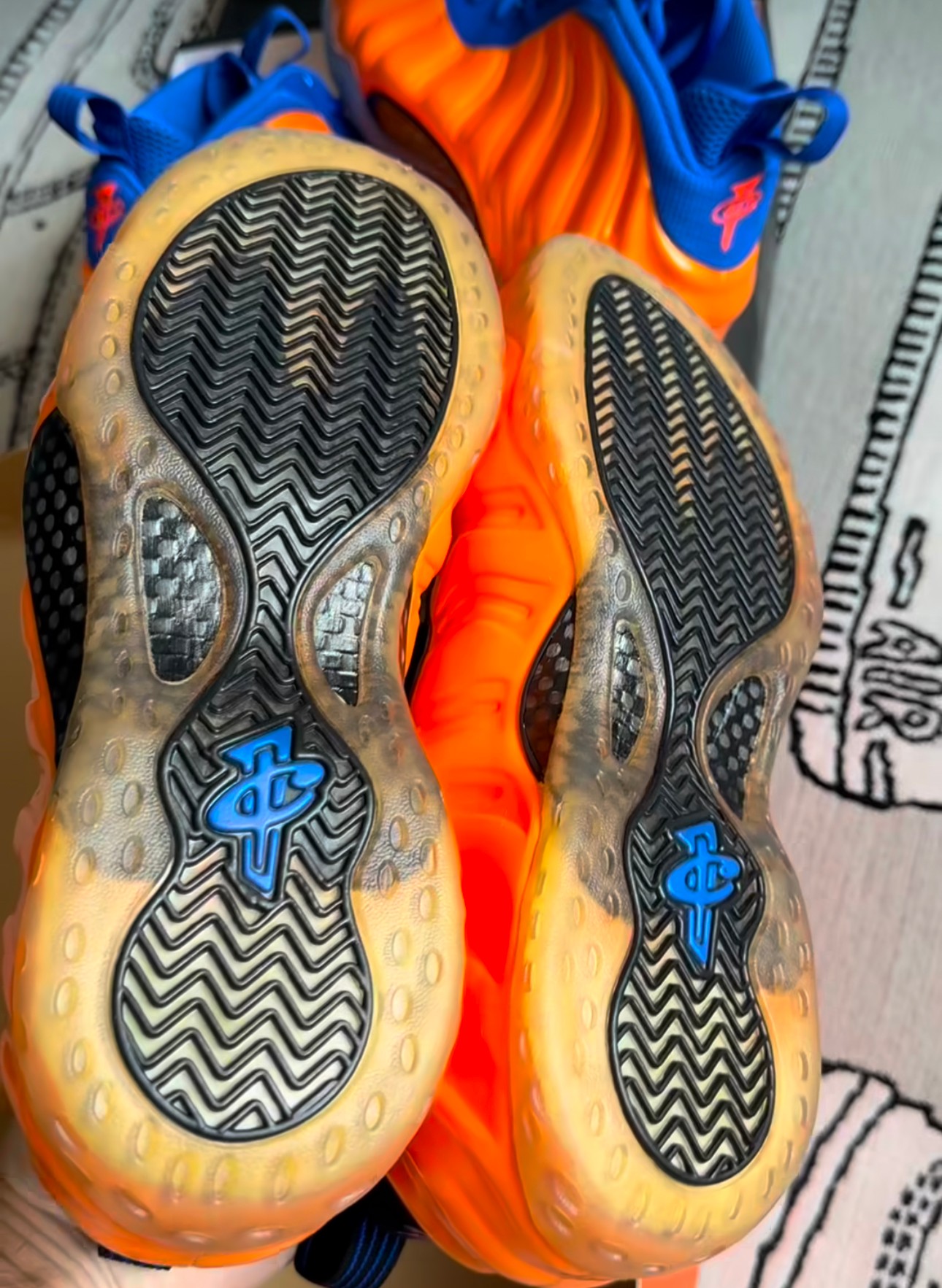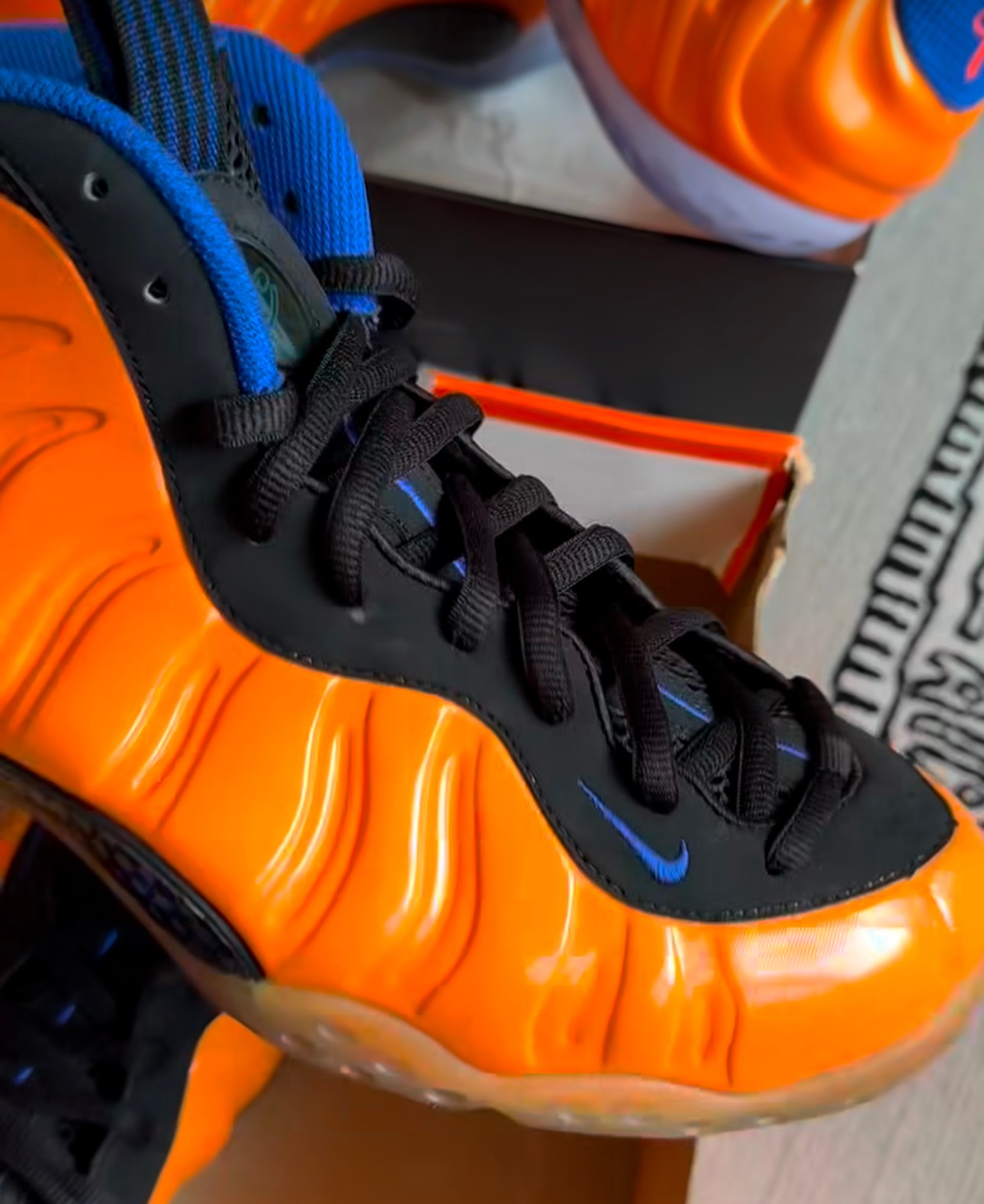 可以看出,鞋身采用尼克斯队标志性的橙色示人,后跟鞋领则与 2014 年市售的「尼克斯喷」不同,采用黑色包覆,蓝色覆盖内衬。
