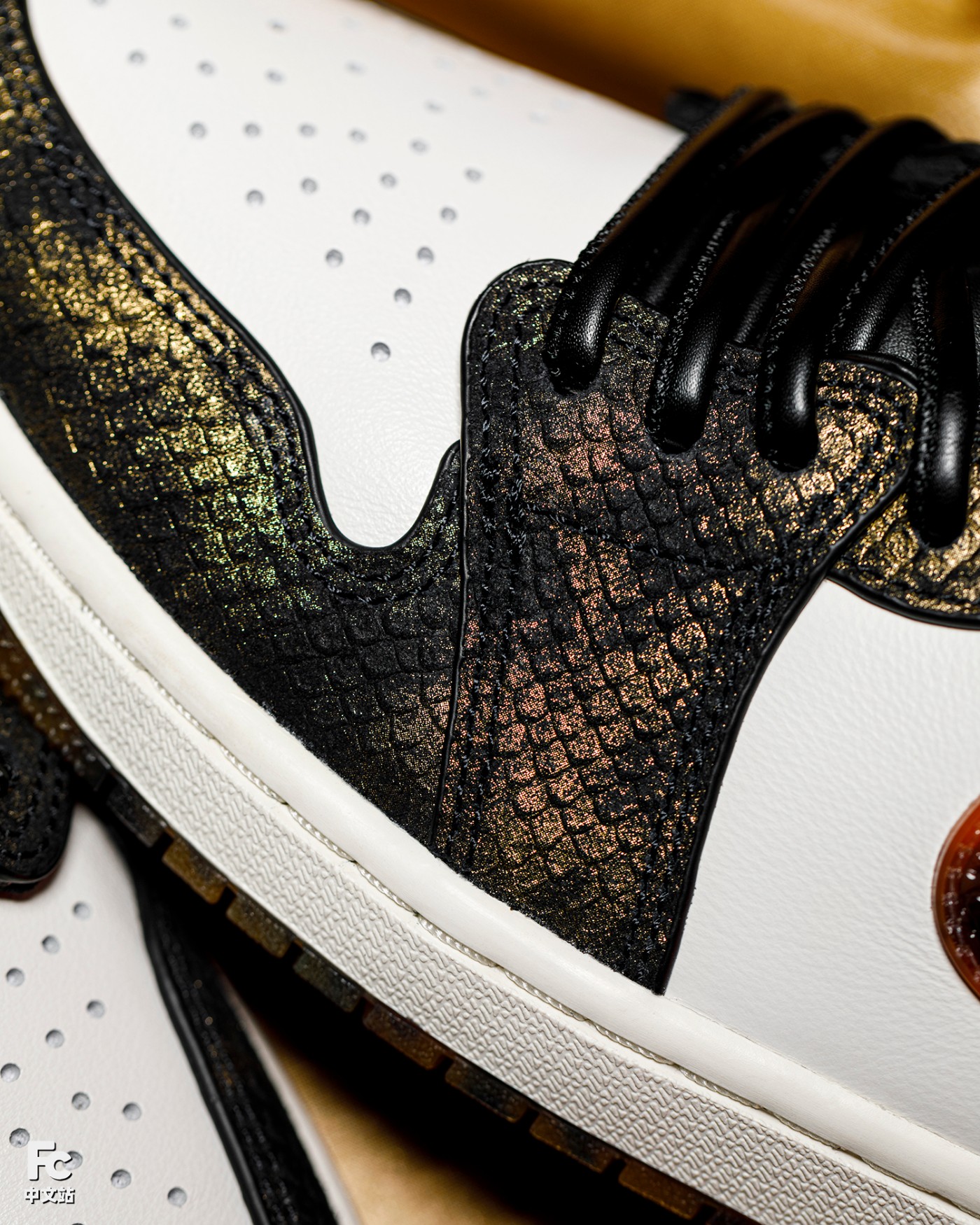 鞋帮的飞翼 Wings 标志与随鞋附赠的白色款鞋带头,都由 24K 电镀金加持, 进一步凸显「蛇年限量」的高雅格调。