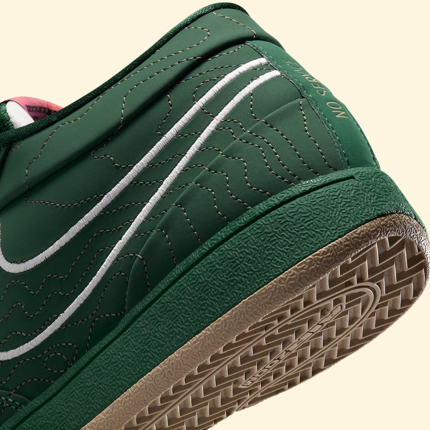 整体鞋身配色也有墨绿色示人,鞋舌标签醒目呈现 Flagstaff 山峰的日落景象。