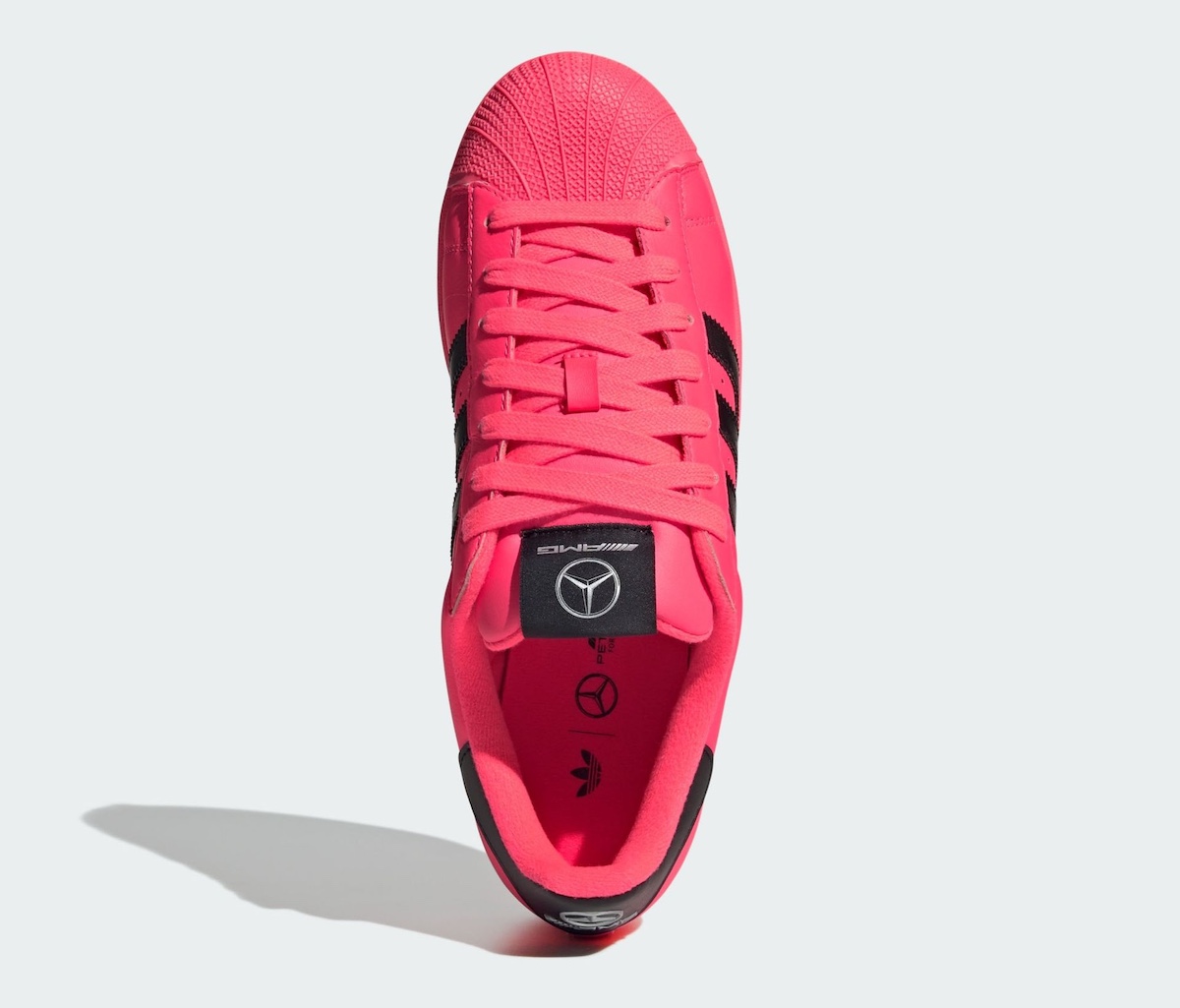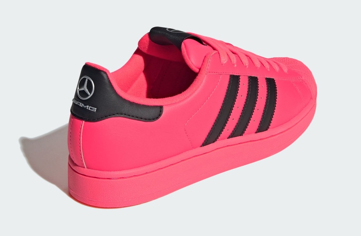 这双 Mercedes-AMG x adidas Superstar 在鞋舌和后跟都带有醒目的「AMG」标志,彰显了它的合作身份。