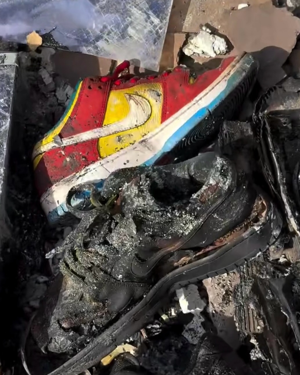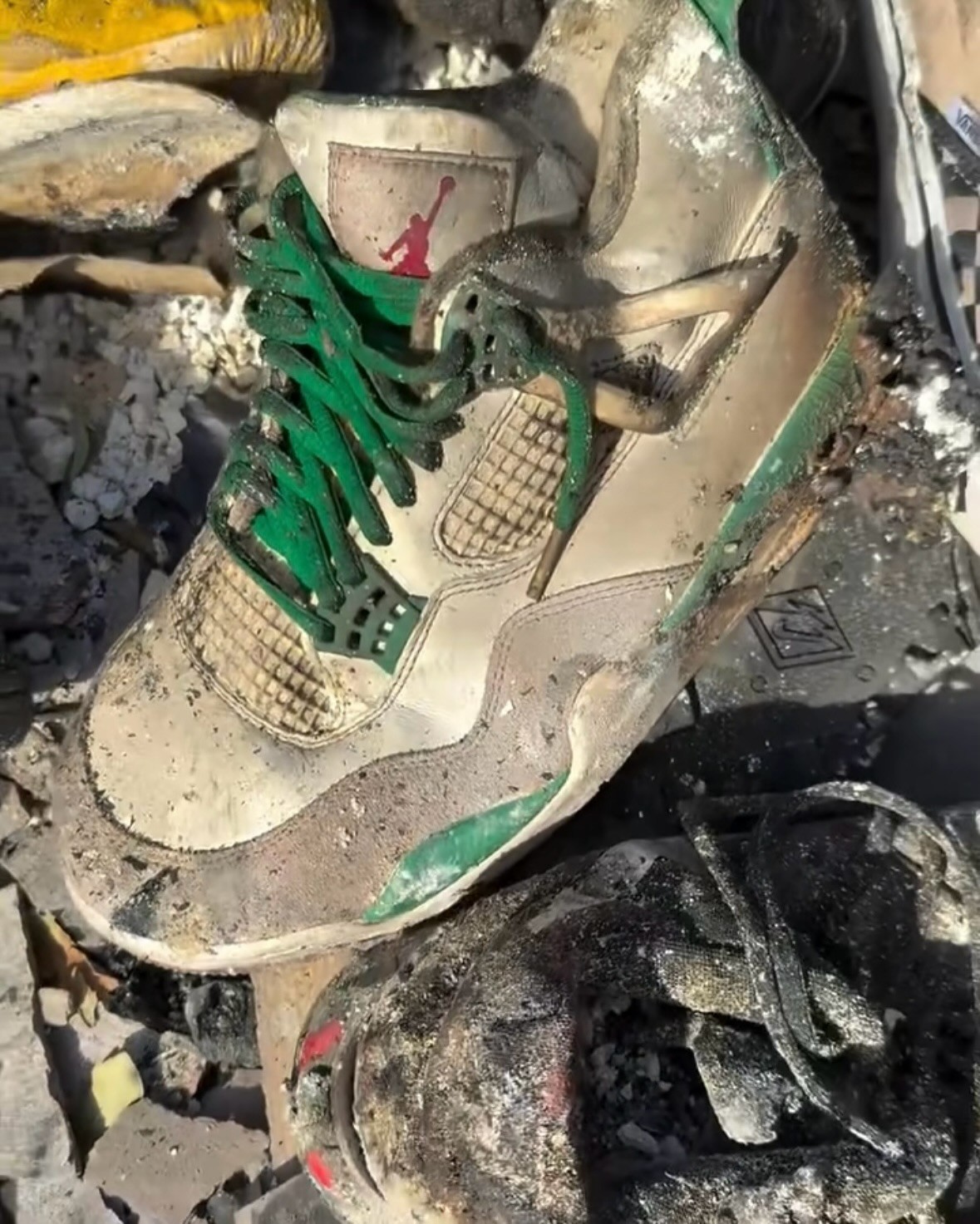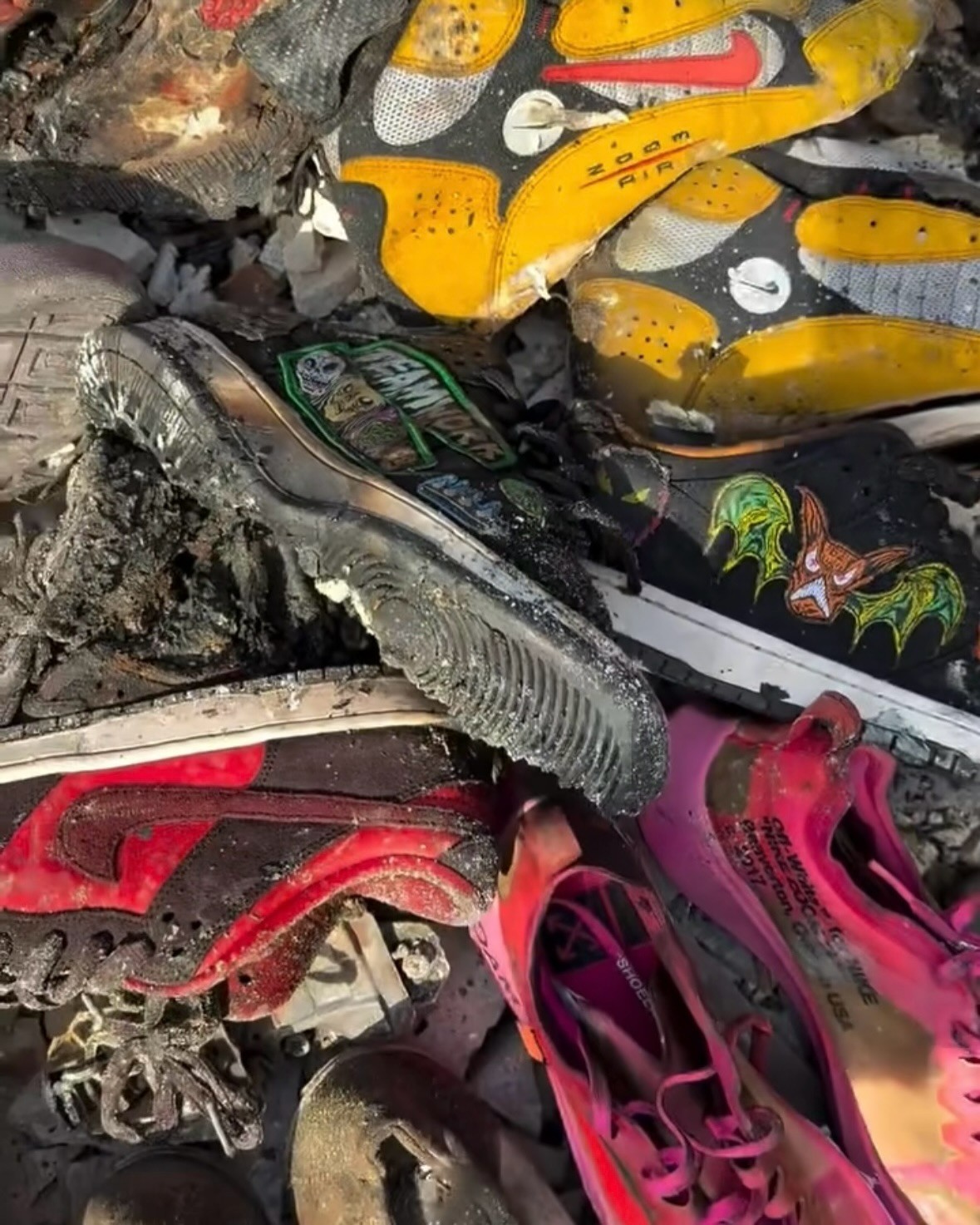很多球鞋都被烧的面目全非,当然也有一些依稀能辨别出具体是什么配色。