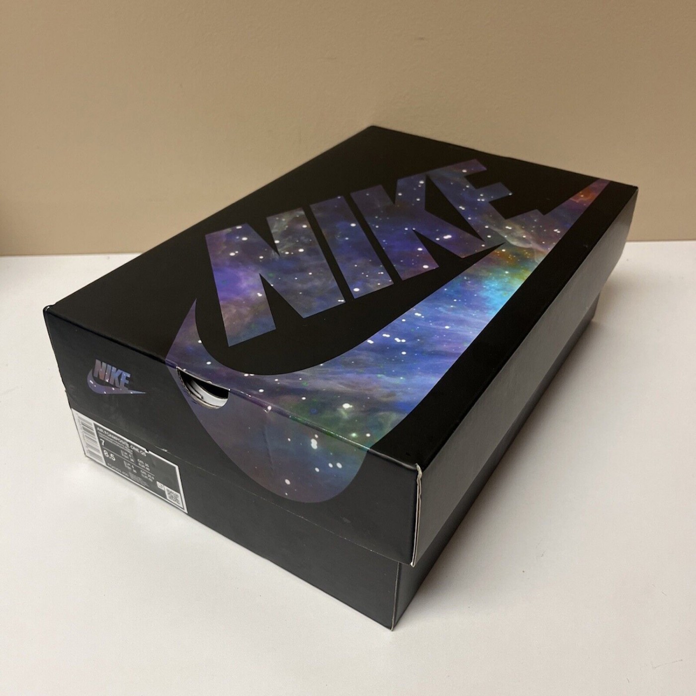 而鞋盒包装本次首次披露,不同于当年 NSW 的卡其色鞋盒,本次将星空元素注入黑底衬托的 Nike 标志之中,进一步突显银河喷的专属身份。