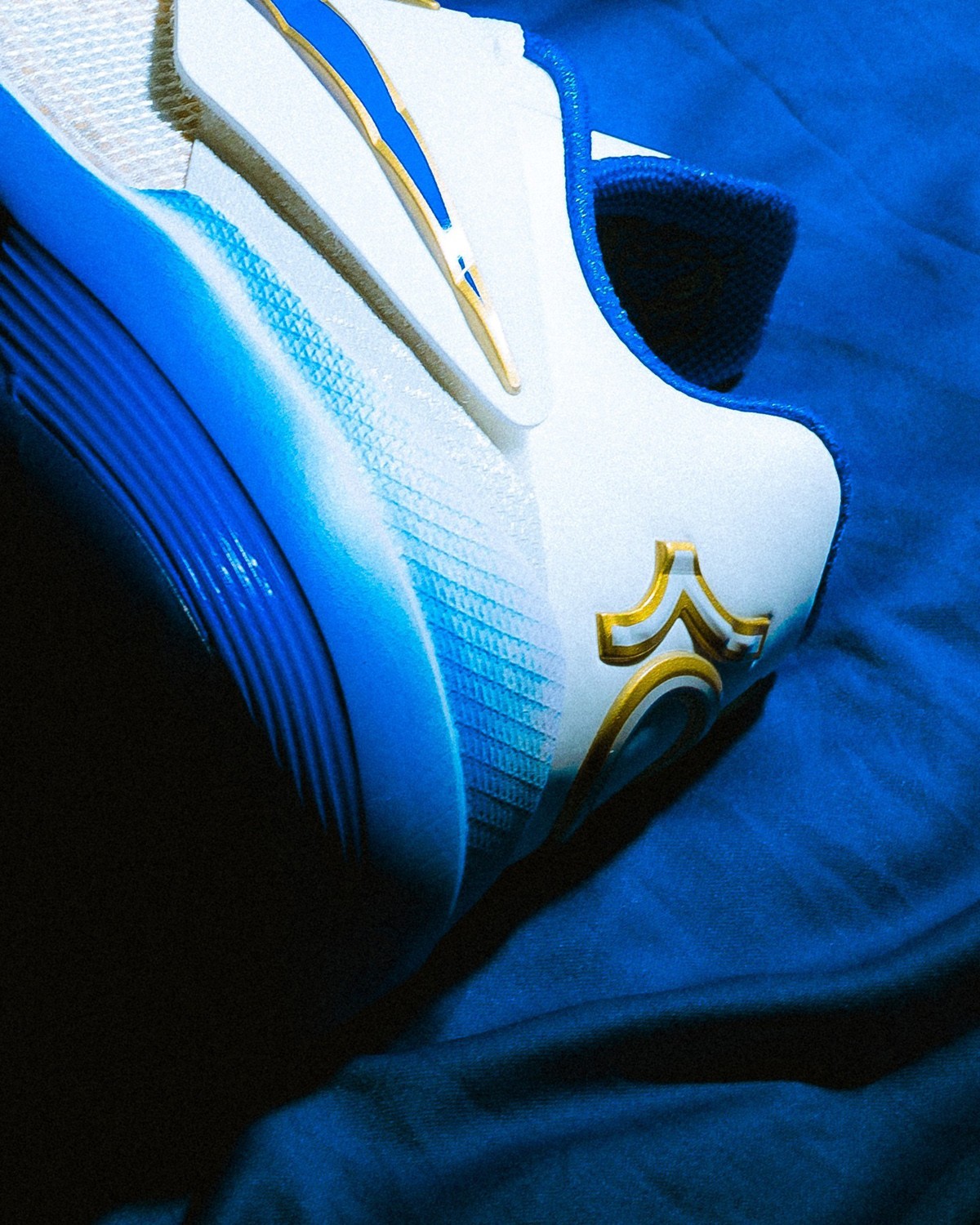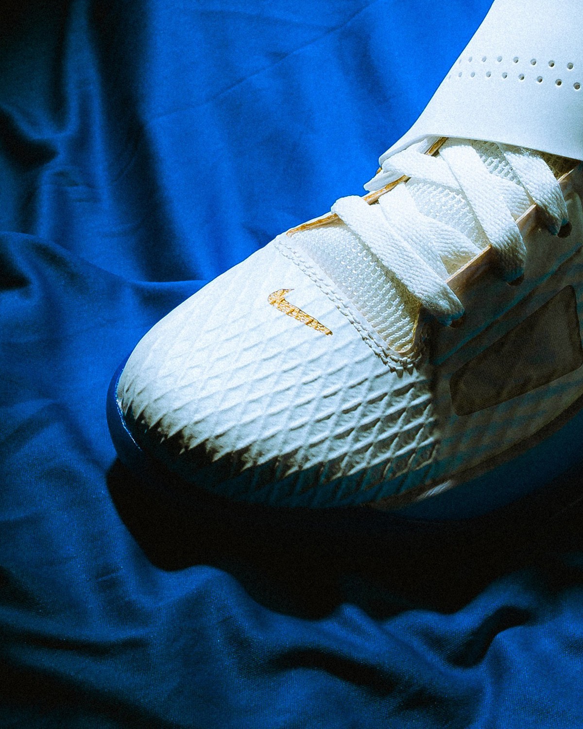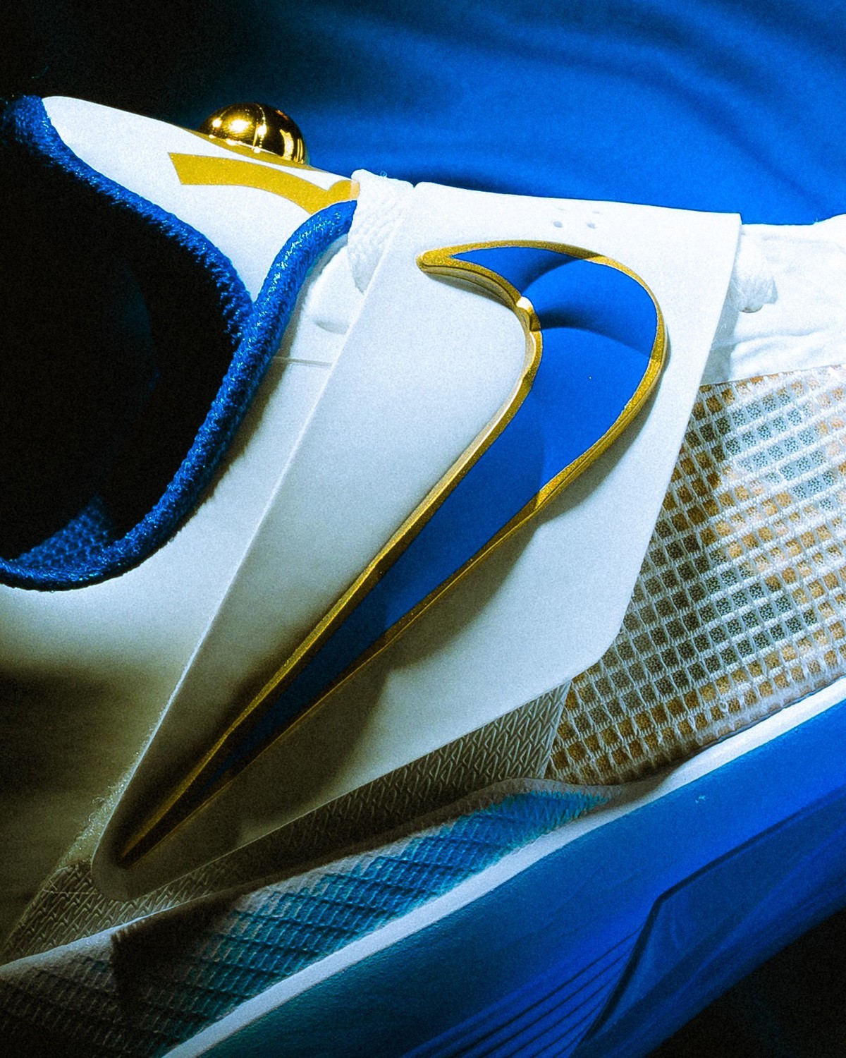 鞋身加入许多新规设计,鞋面的网格来自篮网,钻石切割纹理呈现在每一处 Logo 的位置,还有金色勾边。