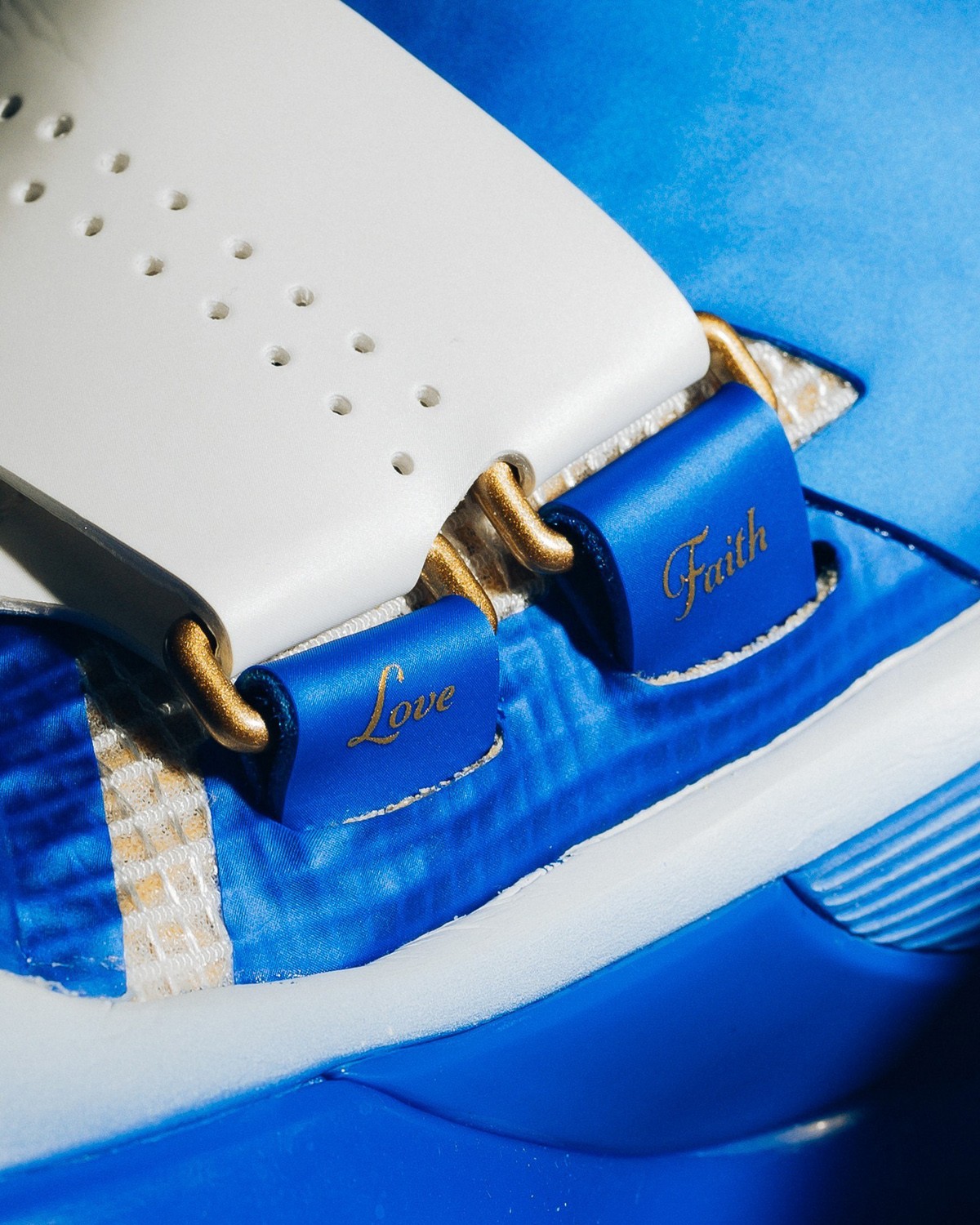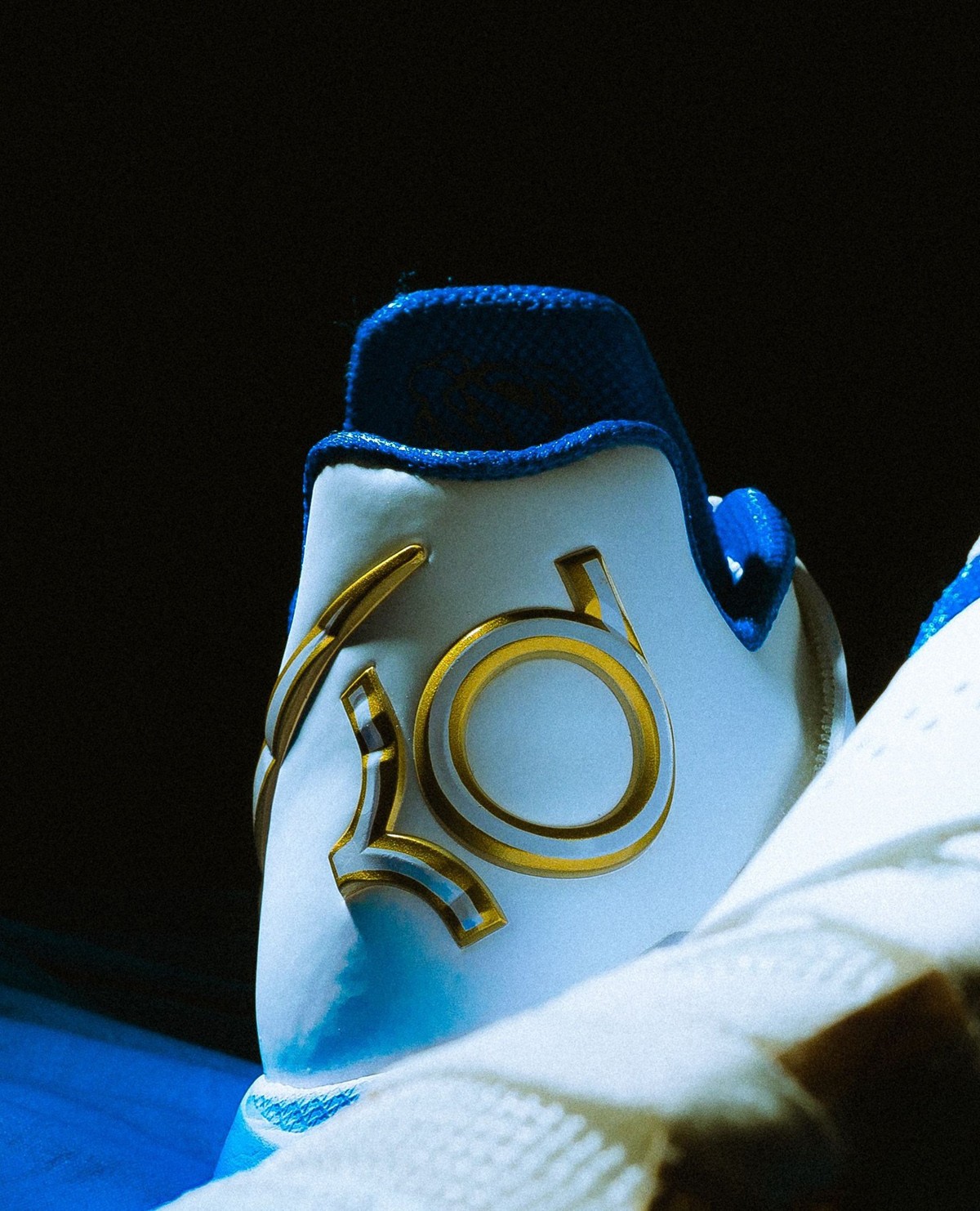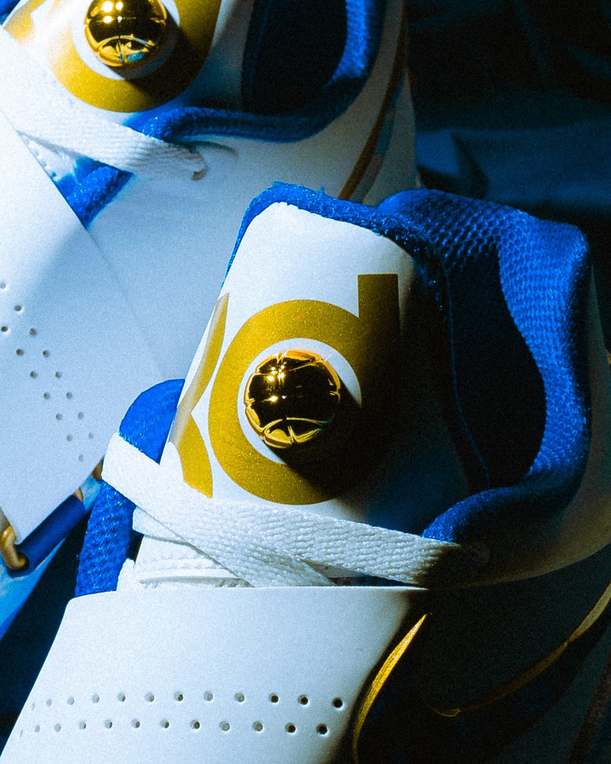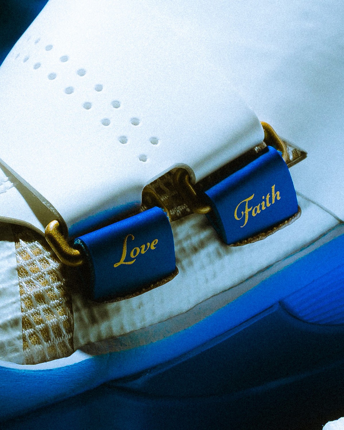 鞋身加入许多新规设计,鞋面的网格来自篮网,钻石切割纹理呈现在每一处 Logo 的位置,还有金色勾边。
