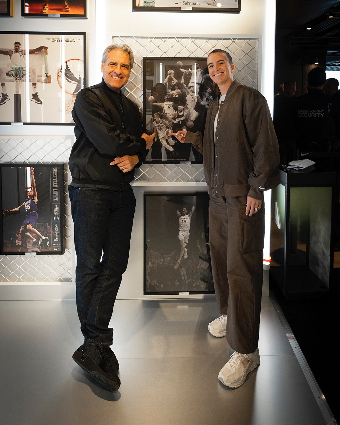 除了穿上 Nike 最新为 WNBA 现役第一人阿贾·威尔逊打造的首款签名鞋 A'One “Pink Aura” 配色外,在与萨布丽娜的合影中,还上脚本次 Nike 全明星特别企划「Black Label」的 Sabrina 2。